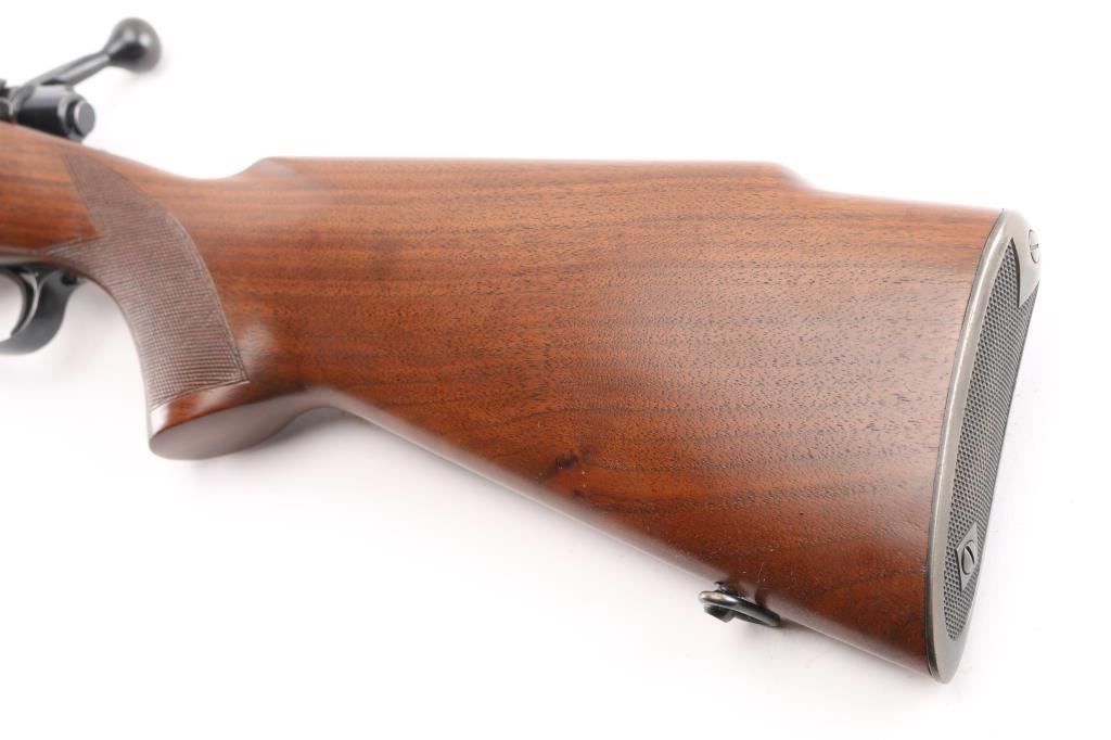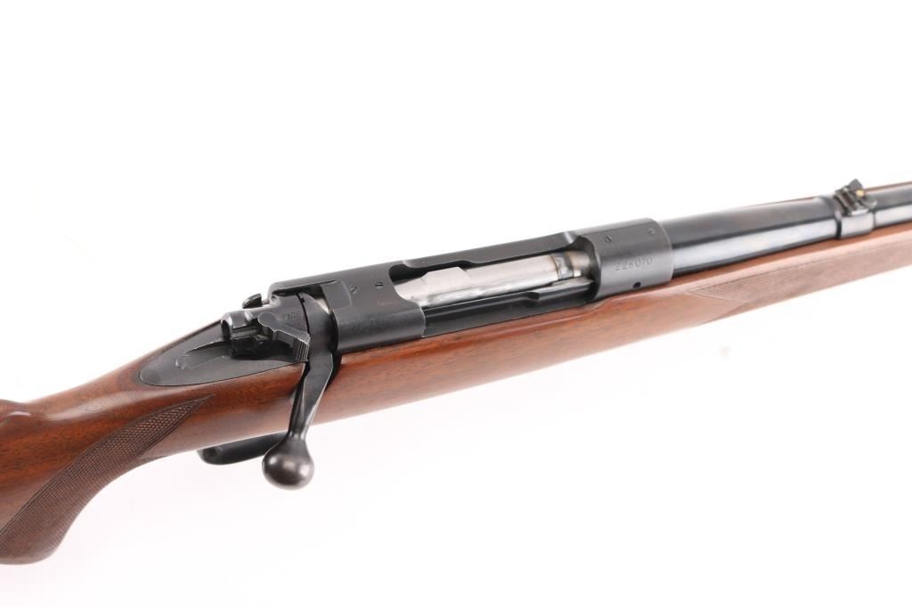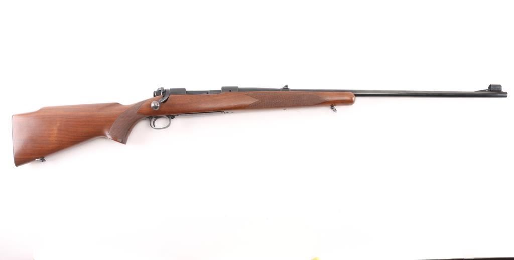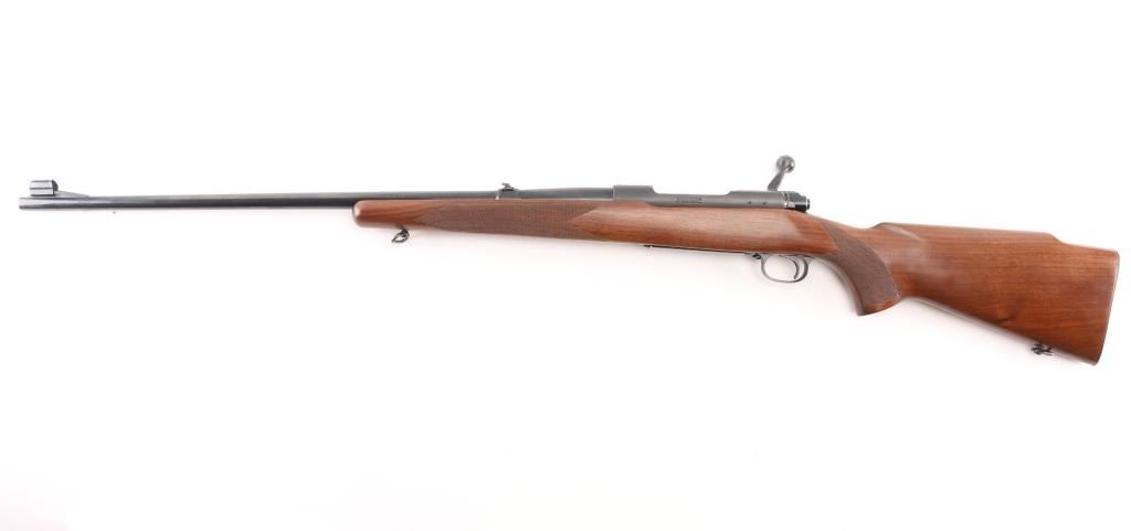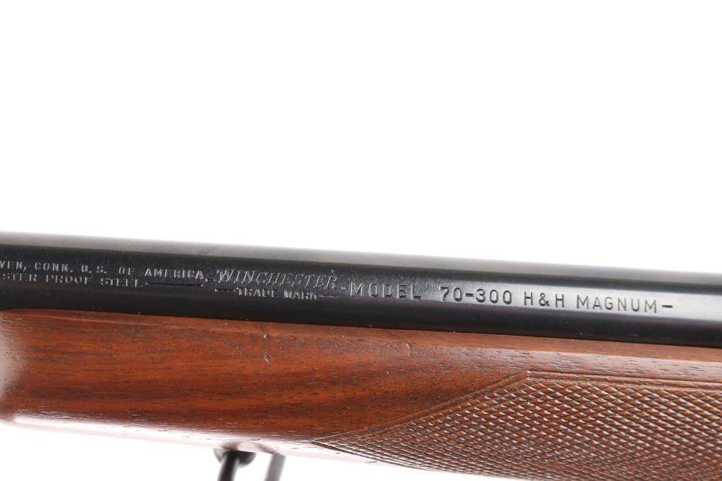 SN: 228070 Desirable control feed bolt action sporting rifle chambered in .300 H&H Mag., manufactured circa 1951. Features a blued finish, 26" tapered barrel, hooded, ramped blade front sight with bead top, flip-up adjustable rear sight, serrated trigger, three-position safety on the rear of the bolt, internal box magazine with hinged floorplate, and checkered walnut pistol grip shoulder stock with raised comb, factory checkered steel buttplate. Sling swivels. Receiver drilled/tapped for optics. Blued barrel, matte receiver. Rifle exhibits approximately 97% of it's original finish with some minor scratches. Action is smooth, the bore appears excellent/bright. Wood stock is excellent. Action is smooth. A really nice one. Condition is NRA Excellent. C&R Firearm.