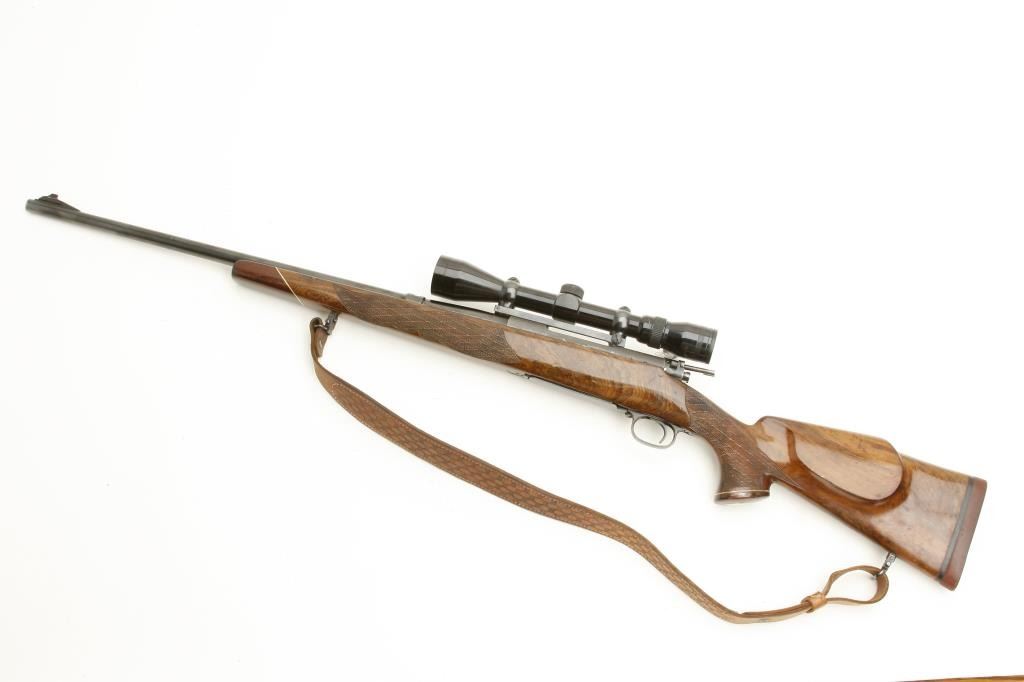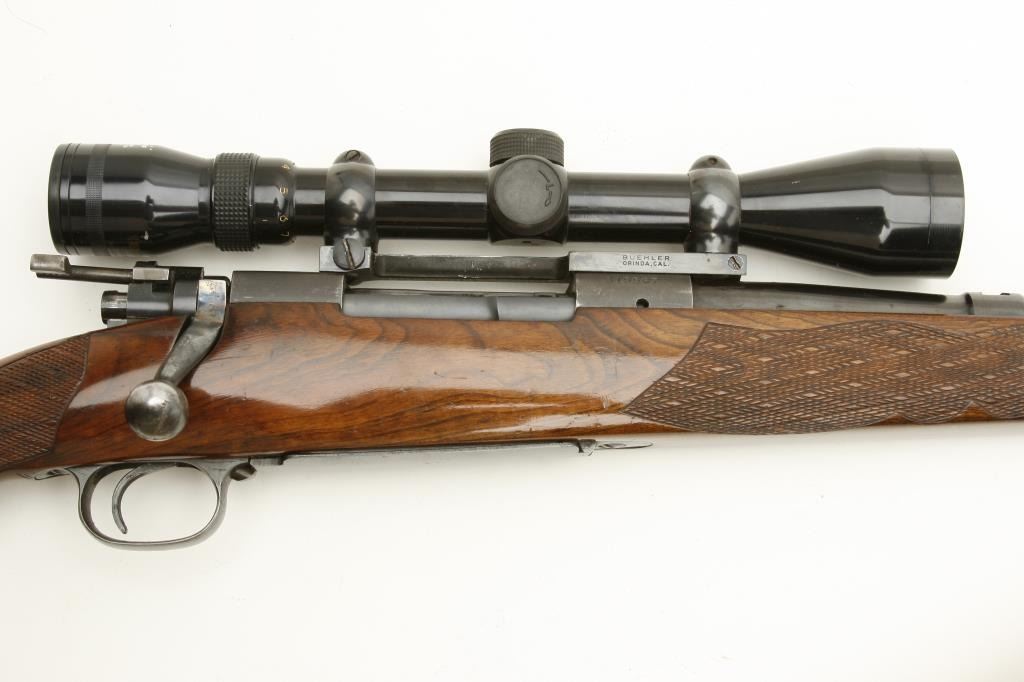 Mag. with custom high grade select walnut stock, S/N 315567 mounted with a Tasco adjustable scope on Buehler mounts and deluxe Q.D. sling swivels with Boyt sling. The stock works is very high quality with a premium selected for grain hand checkered skip line pattern stock. The styling is west coast 1960s to 70s and would be very expensive to replicate at today’s rates. The metal has been refinished at point of customization. In good to very good condition needing light refinishing to stock. Good action and bright bore. (C&R) Est.: $700-$1400