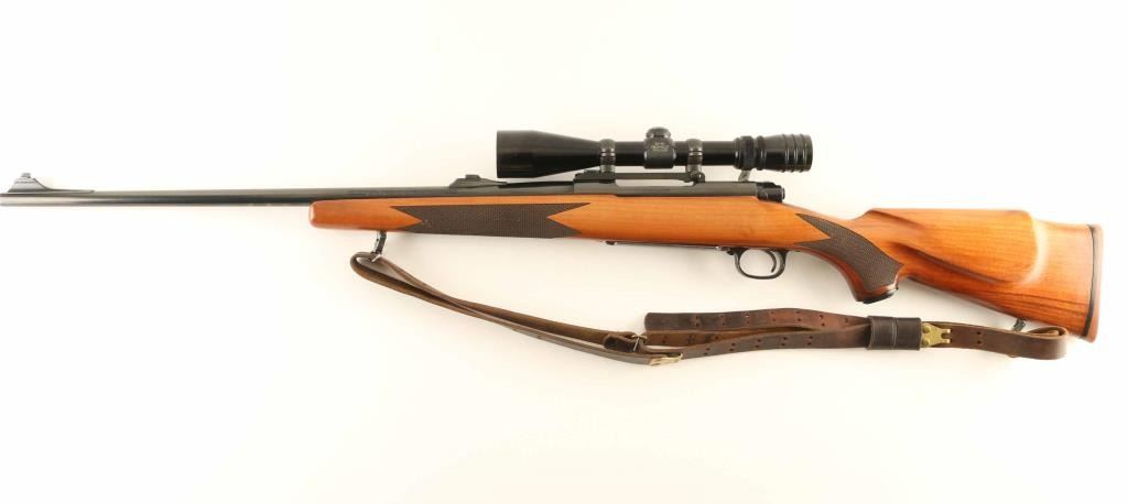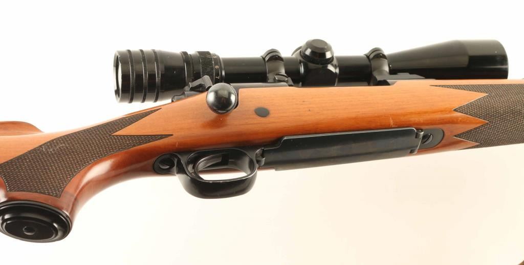SN: G1868247 Bolt action rifle features blued finish, wood stock with right handed cheek piece, solid rubber butt pad, sling studs, 24" barrel, blade front sight, folding rear sight, Redfield scope mount, manual safety. Bore is excellent. Retains 85% blue with scratches and dings from handling and use. Stock is very good to excellent condition with small dents and scratches. Mounts a very good condition 3-9x Redfield Tracker scope with duplex reticle, clear view. Includes a very good condition leather sling. Condition is NRA Very Good *** Modern Firearm ***