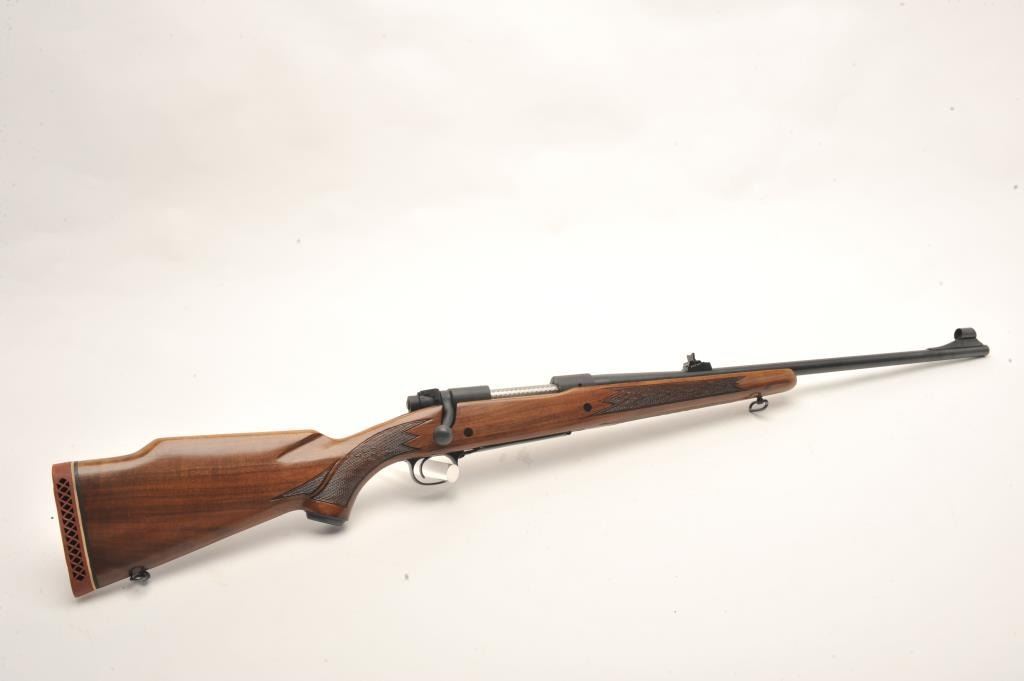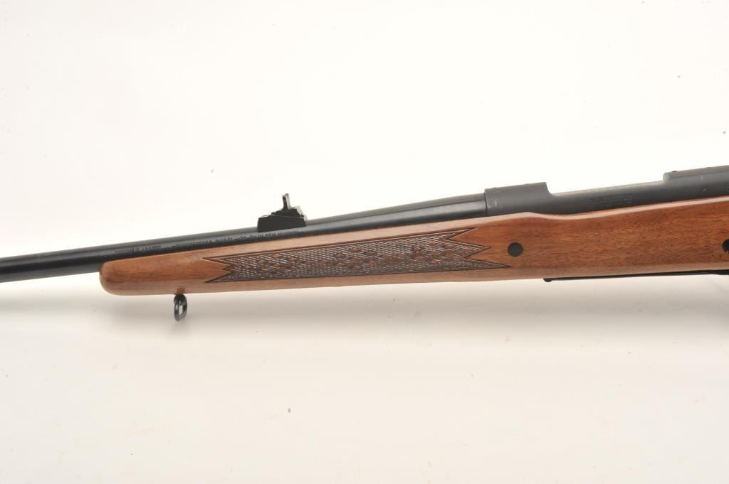 Winchester Model 70 bolt action rifle, 7mm Rem. Mag. caliber, 24” barrel, mat black finish, checkered wood stock, Winchester hard rubber butt pad, S/N 858563, in overall fine condition displaying the majority of itsoriginal finish, fine bore, action, markings and wood. (Modern). Est.: $300-$600.