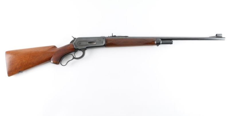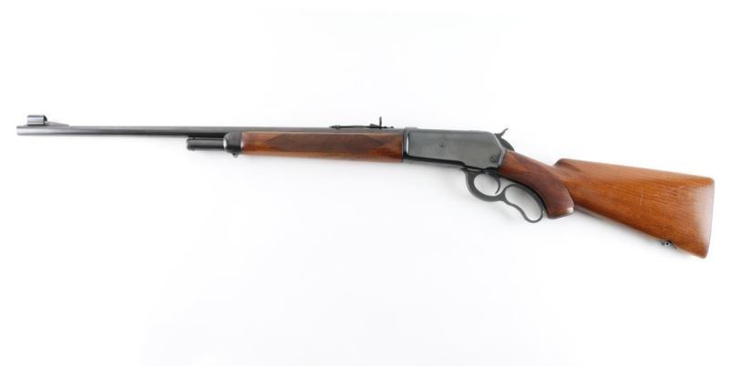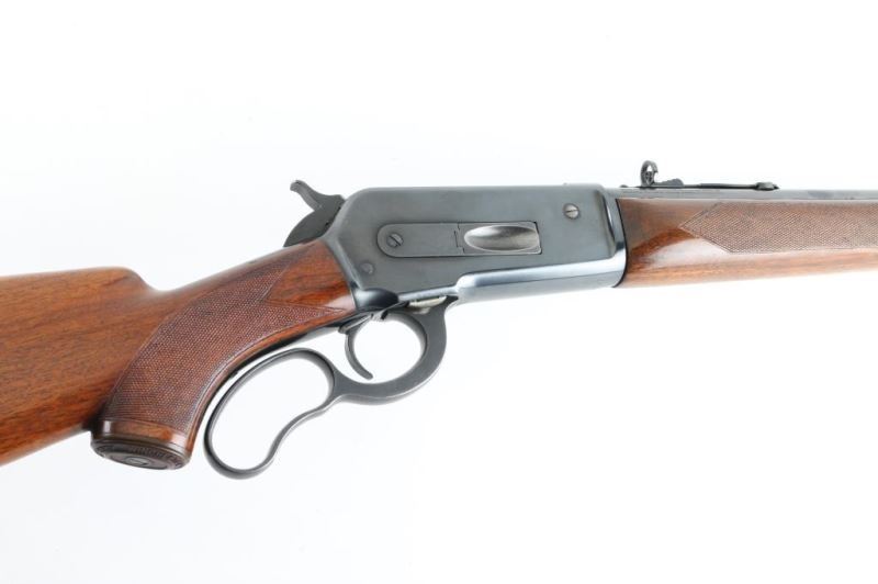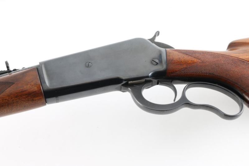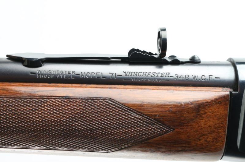 Pre-64 Eastern Carbine' Vintage lever action repeating rifle chambered in .348 Winchester, manufactured in New Haven, CT circa 1940. Features a blued finish, 24" tapered barrel, half-length tube magazine, ramped blade front sight, period after-market peep sight in circle type adjustable rear, has original buckhorn base, smooth trigger, serrated hammer spur, steel receiver, steel forecap, checkered walnut forend and checkered grip shoulder stock with knurled steel buttplate. Sling swivels. Action is smooth/tight. Bore appears good with strong rifling, but dirty. Wood is very good with some minor scratches/dings. Blued finish is about 98% with minor edge wear/scratches. A really nice vintage 71.