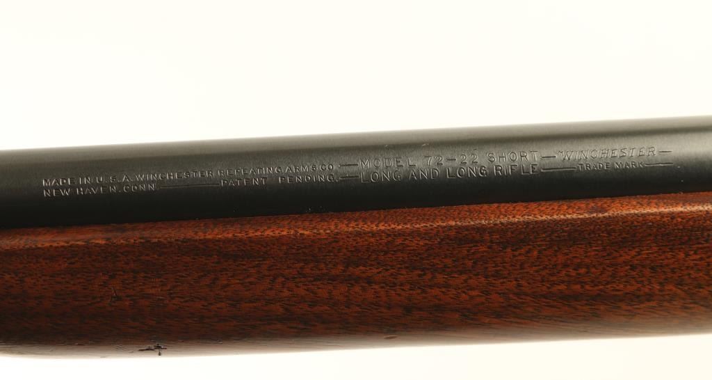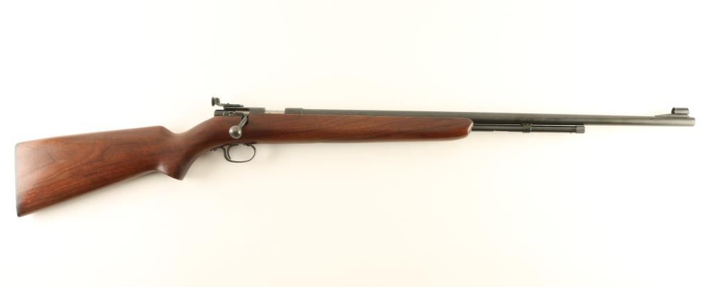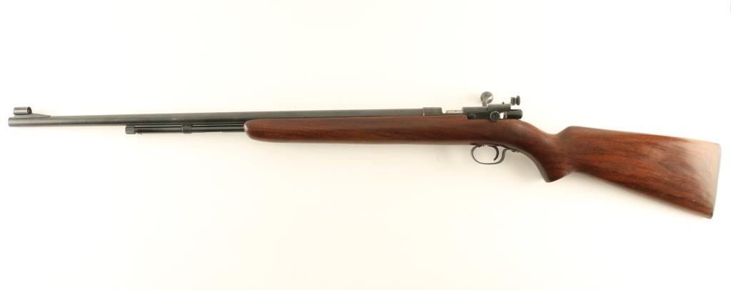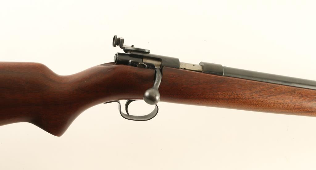 Bolt action rimfire rifle features blued finish, wood stock with curved grip, flat plastic buttplate, 25" barrel, hooded blade front sight, receiver mounted rear peep sight, tube magazine under barrel, manual safety. Bore is excellent condition. Retains 95% blue with scratches on barrel, some bare metal on sharp edges. Stock is very good condition with dents & scratches. Condition is NRA Very Good ++ *** C&R Firearm ***