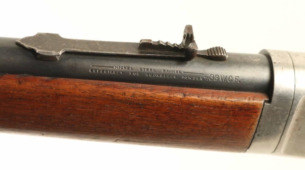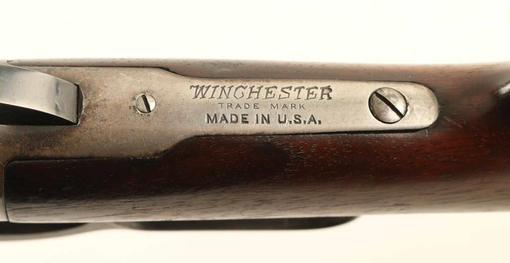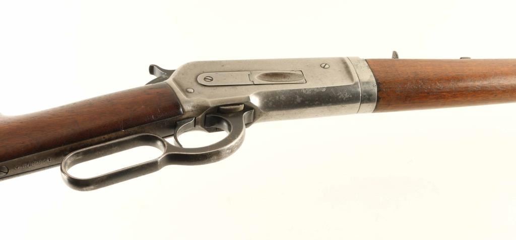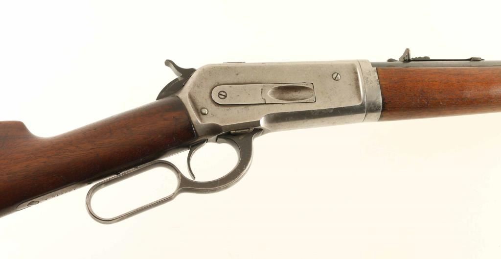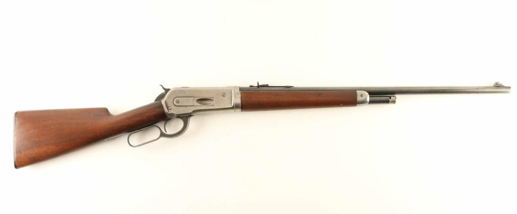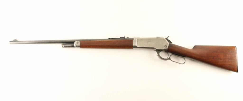 "Takedown Rifle" manufactured circa 1921. Features 24" round barrel (marked 'nickel steel'), half length magazine tube with take-down lever at cap, buckhorn sights (front sight marked "Lyman"), straight grip, shotgun butt with checkered gutta percha buttplate. Bore is very good condition, bright with sharp rifling. Barrel & magazine tube retain 70% blued finish, with scratches & scrapes, small areas of patina, bare metal at muzzle. Action is mostly bare metal, dull light gray in color, with traces of bluing remaining at edges of receiver scallops, lower tang, sides of lever. Screw slots are fair condition with light marring. Wood is good condition with scratches and dents, oil staining at wrist. Wood fit to metal and buttplate are both good. Buttplate is good condition. Action is smooth. Markings are sharp and even. Marked "MODEL 1886" on right side of barrel, "MADE IN USA" on left side of barrel. Condition is NRA Good + *** C&R Firearm ***