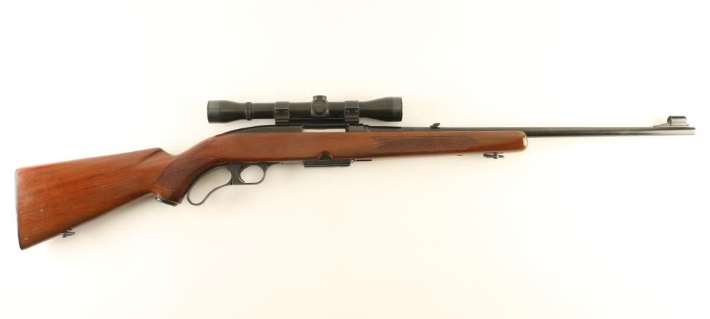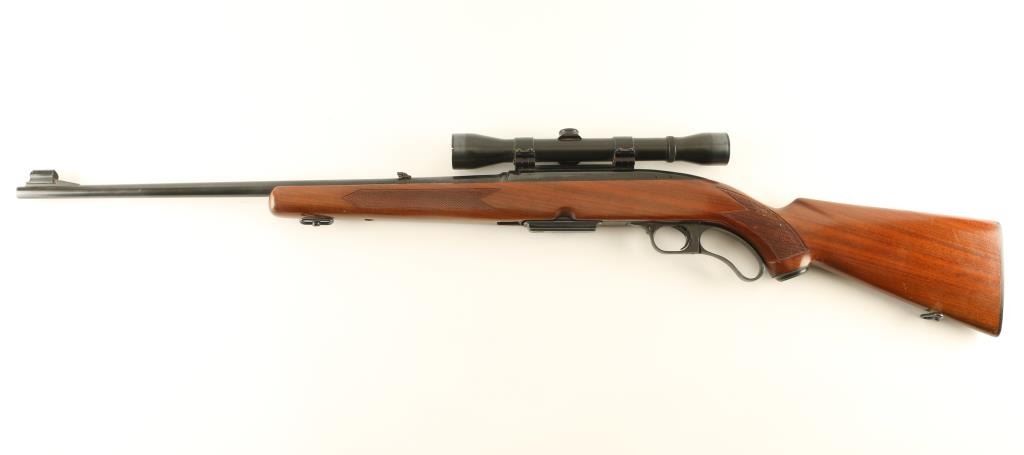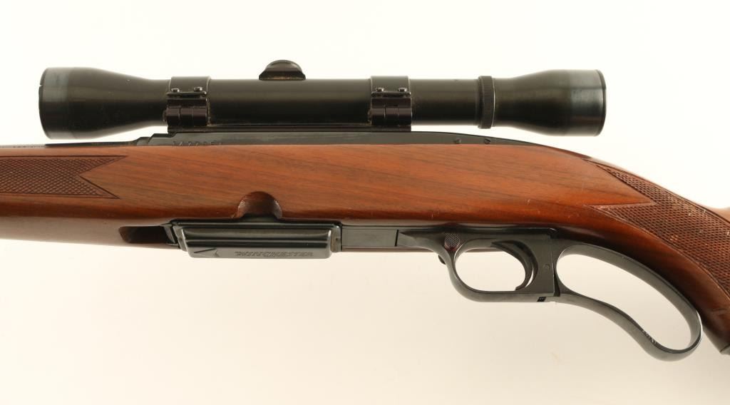 Lever action rifle manufactured circa 1963. Features blued finish, wood stock with curved grip, checkered panels at wrist & forend, flat plastic buttplate, 22" barrel, hooded blade front sight, folding adjustable rear sight, Weaver rail attached to receiver top, detachable box magazine, manual safety, sling swivels. Bore is very good condition. Retains 90% blue, with scratches & scrapes on barrel. Wood is very good condition with dents & scratches. Mounts a good condition Weaver K4 scope with post reticle, good view. Includes (1) magazine. Condition is NRA Very Good ++ *** C&R Firearm ***