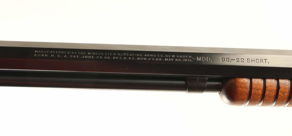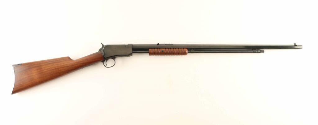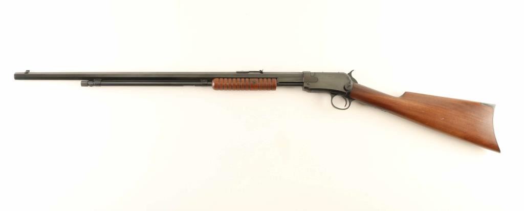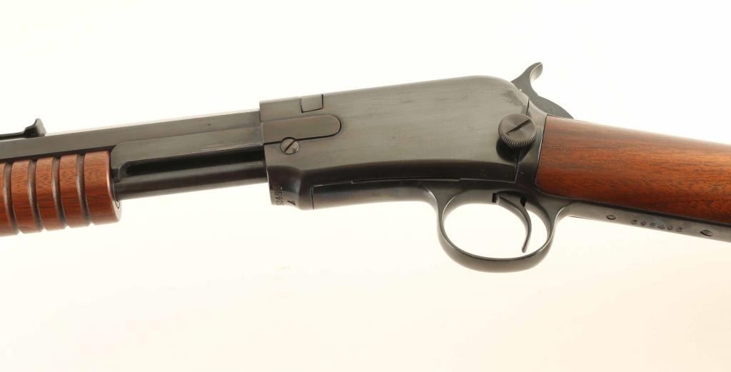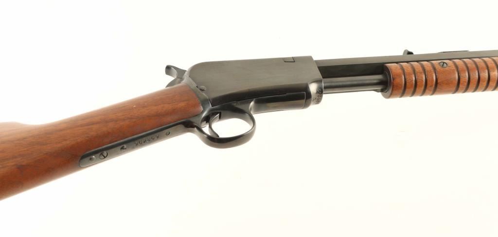 Pump action rimfire rifle manufactured circa 1926. Features blued finish, groove wood pump handle, wood butt with straight grip, blued steel crescent buttplate, 24" octagon barrel, buckhorn type sights, tube magazine under barrel, external hammer, takedown screw on receiver left side. Bore is excellent. Metal retains 95% finish with few scratches and scuffs. Wood is excellent, with few small dents. Numbers match. Condition is NRA Excellent *** C&R Firearm ***