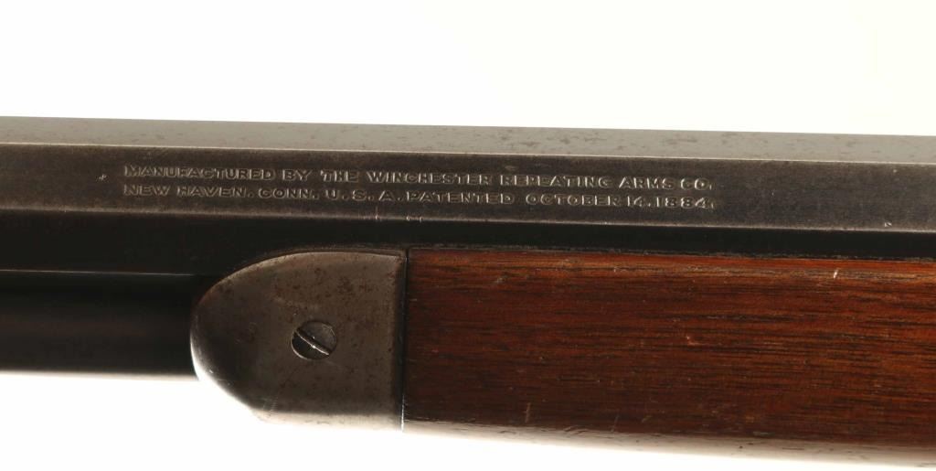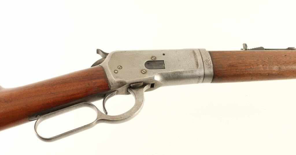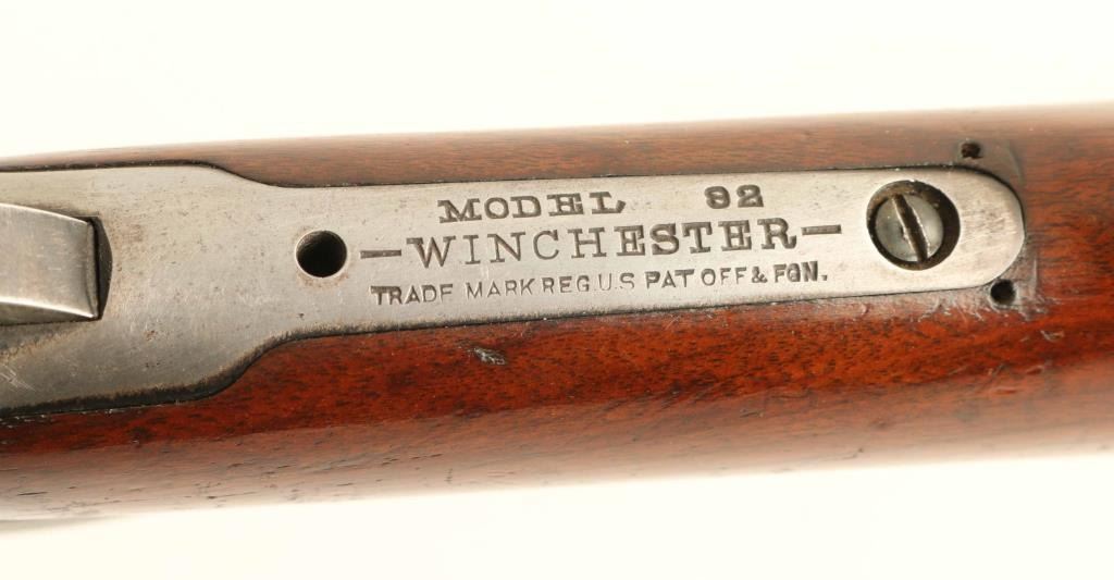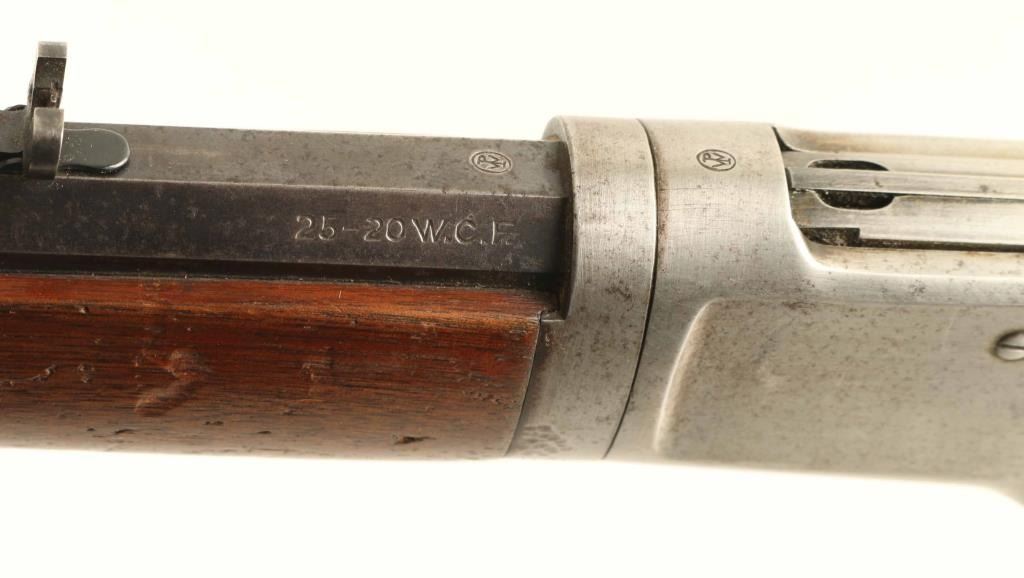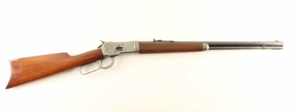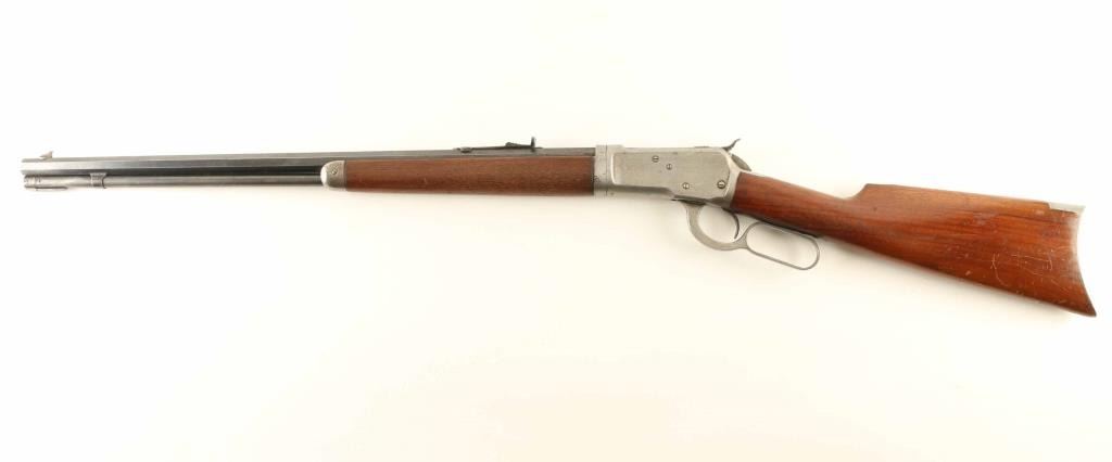 Takedown 'Sporting Rifle' manufactured circa 1924. Features 24" octagon barrel, full length magazine tube, takedown lever at magazine cap, buckhorn sights (rear marked "MARBLE", straight grip, steel crescent buttplate. Bore is fair condition, frosted with sharp rifling. Barrel & magazine tube retain 70% graying blued finish, thinning or showing bare metal at edges of flats, places on mag tube. Action is mostly dull silver colored bare metal, small areas of pitting, small dents or tool marks on lower sides of receiver extension. Screw slots are generally good. Forend is good condition, dented & scratched, with good fit to metal. Butt is good or better condition with creases and dents, good fit to buttplate. Two line barrel address and other barrel markings are crisp and even depth. Tang markings are partially eroded. Action operates smoothly. Condition is NRA Good *** C&R Firearm ***