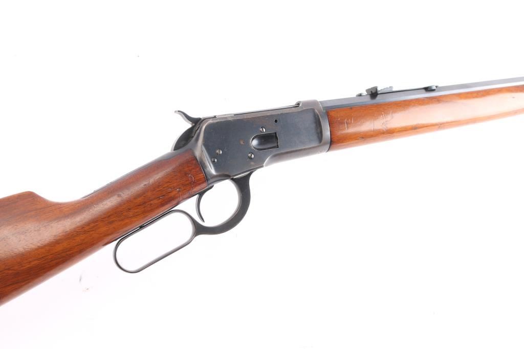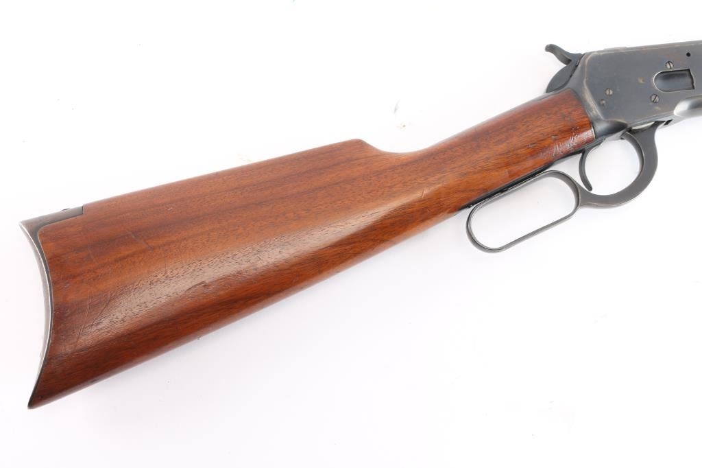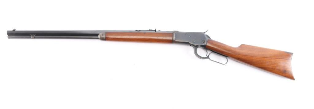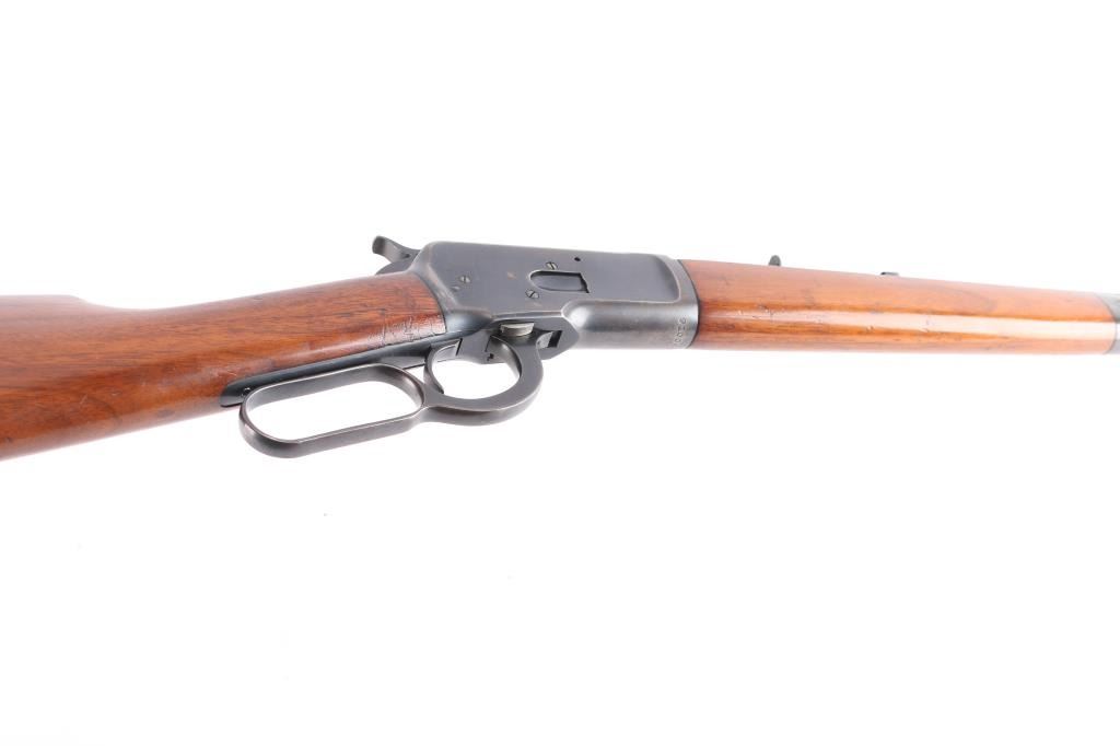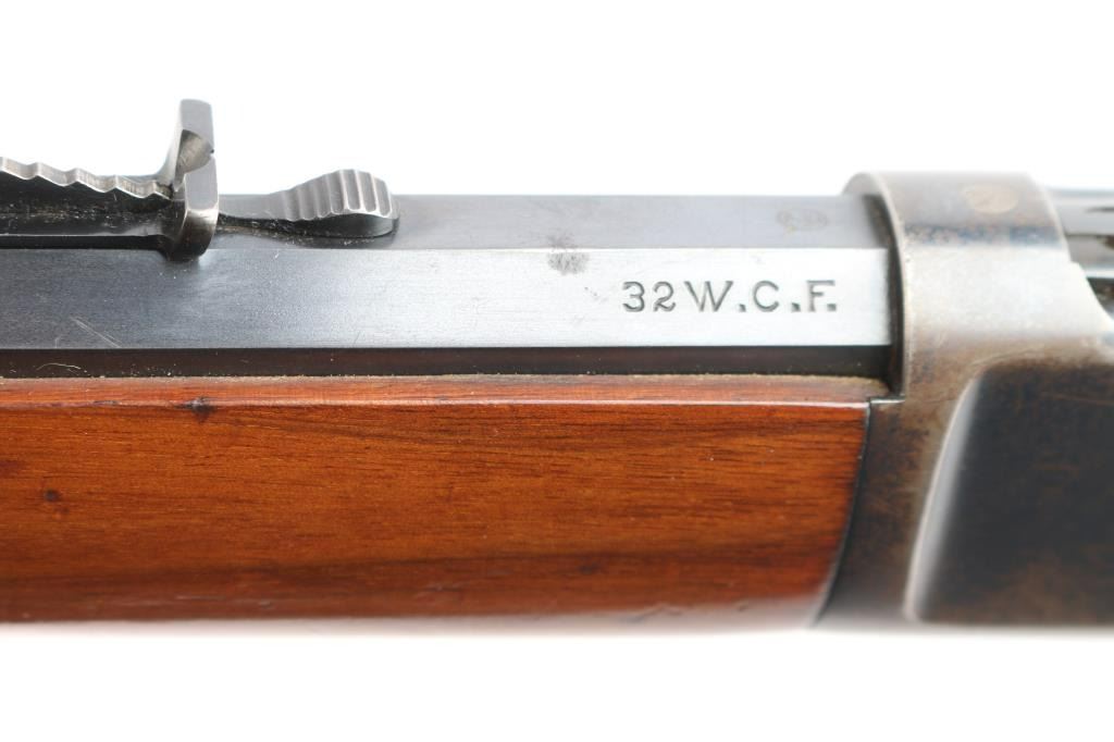 Vintage lever action rifle chambered for .32 Winchester Center Fire ammunition circa 1920. Features a 24" octagon barrel, full length magazine tube, blade front sight, adjustable rear sporting sight, smooth trigger and knurled hammer spur. Two piece smooth wood stocks have a metal forend cap and a crescent metal butt plate. Blue is about 70% with handling wear, mostly on the receiver & fore cap there is some scattered very light pitting on the receiver, wood is overall very good with minor scratches/dings, has been varnished at some point, action is crisp/tight, bore is very good/bright with strong rifling. Winchester markings & serial number are clear/readable. Comes with an original Lyman No. 1 Combination Tang Sight with patent dates "Jan. 29, 79" and "May 6, 84" and "WS" stamped on the underside (indicates it was designed for Winchester rifles), sight has the screws.