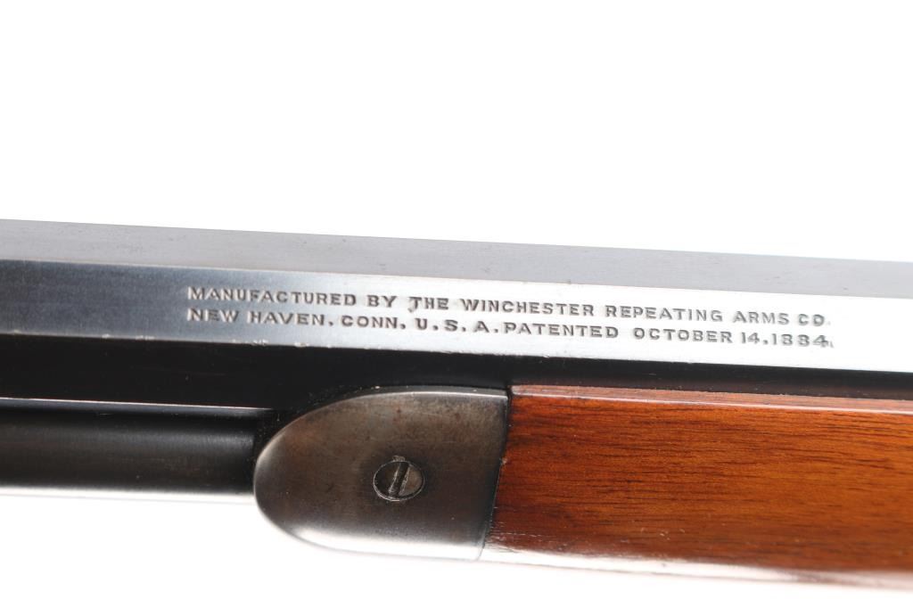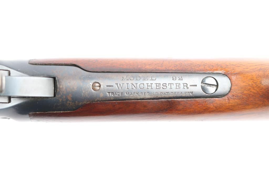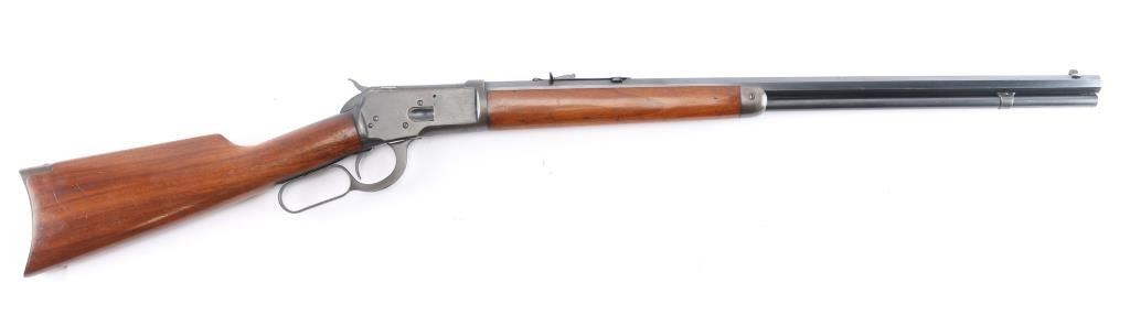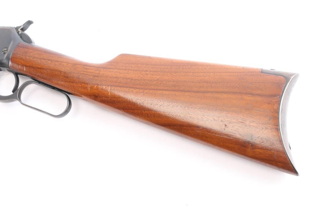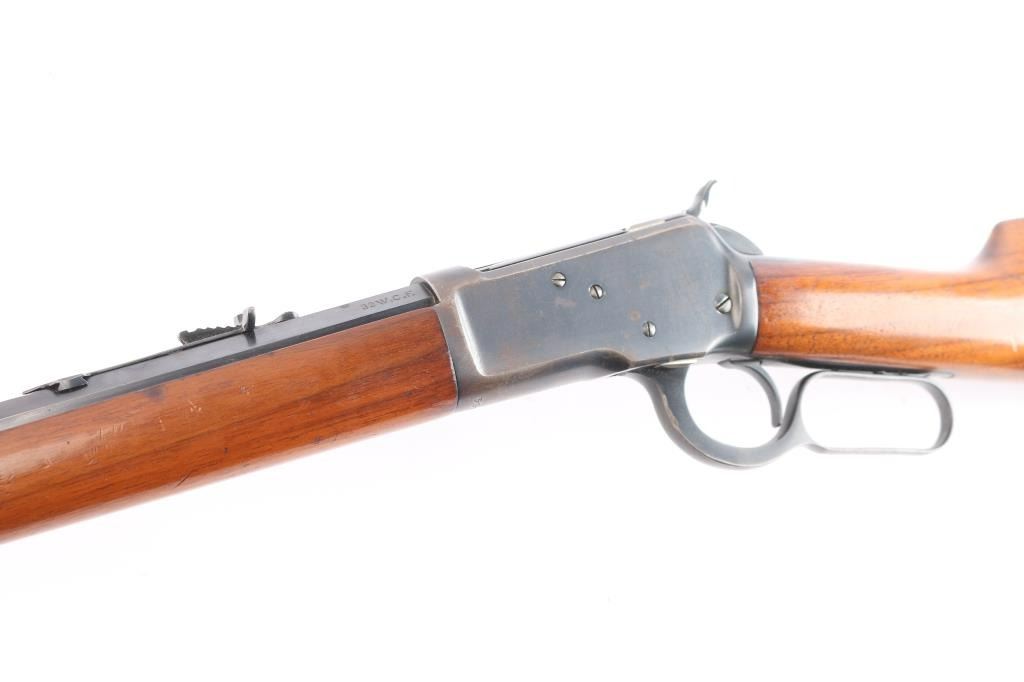 Vintage lever action rifle chambered for .32 Winchester Center Fire ammunition circa 1920. Features a 24" octagon barrel, full length magazine tube, blade front sight, adjustable rear sporting sight, smooth trigger and knurled hammer spur. Two piece smooth wood stocks have a metal forend cap and a crescent metal butt plate. Blue is about 70% with handling wear, mostly on the receiver & fore cap there is some scattered very light pitting on the receiver, wood is overall very good with minor scratches/dings, has been varnished at some point, action is crisp/tight, bore is very good/bright with strong rifling. Winchester markings & serial number are clear/readable. Comes with an original Lyman No. 1 Combination Tang Sight with patent dates "Jan. 29, 79" and "May 6, 84" and "WS" stamped on the underside (indicates it was designed for Winchester rifles), sight has the screws.