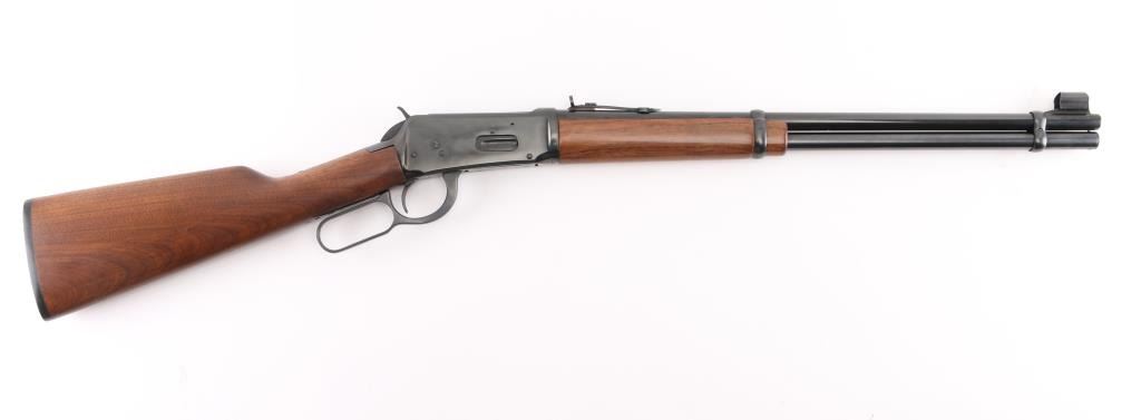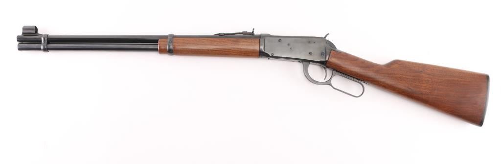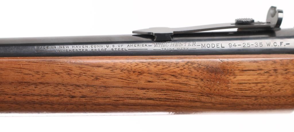 Restored lever action tube fed sporting rifle chambered in .25-35 Winchester Center Fire and manufactured in 1955. Barrel is a Winchester factory replacement. "P" in circle proof. Fully reblued rifle with a 20" barrel, full magazine tube, ramped hooded, front post/bead sight, buckhorn rear sight, replaced non-factory walnut forend and straight grip stock with plastic buttplate. Rifle retains 99% of it's re blue finish and replacement wood excellent . Bore is excellent with strong rifling and action performs smoothly. NRA Condition-Excellent as Restored. C&R Firearm.