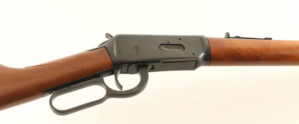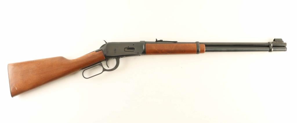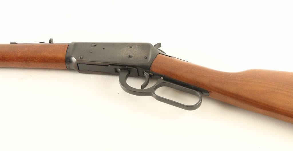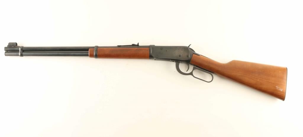 Lever action rifle manufactured circa 1966, features blued finish, plain wood stock and forend, buckhorn style sights, 20" barrel with full length magazine tube underneath. Bore is good condition, should improve with cleaning. Retains 75% bluing with light pinprick patina on right side of receiver, left side has half coverage of cleaned patina leaving discoloration, small spots of rust on barrel. Forend is very good condition. Flat steel butt plate has moderate amount of thin surface rust. Stock is fair condition with chipping and large crack near tang. Condition is NRA Good *** C&R Firearm ***
