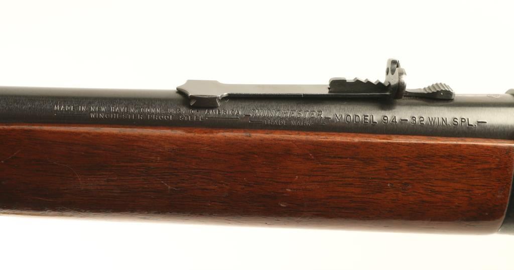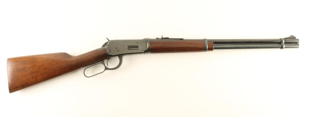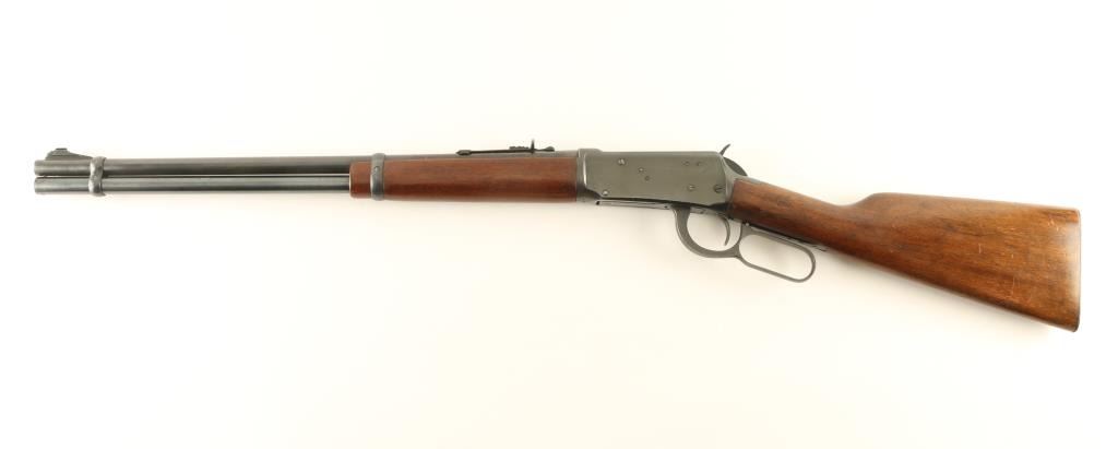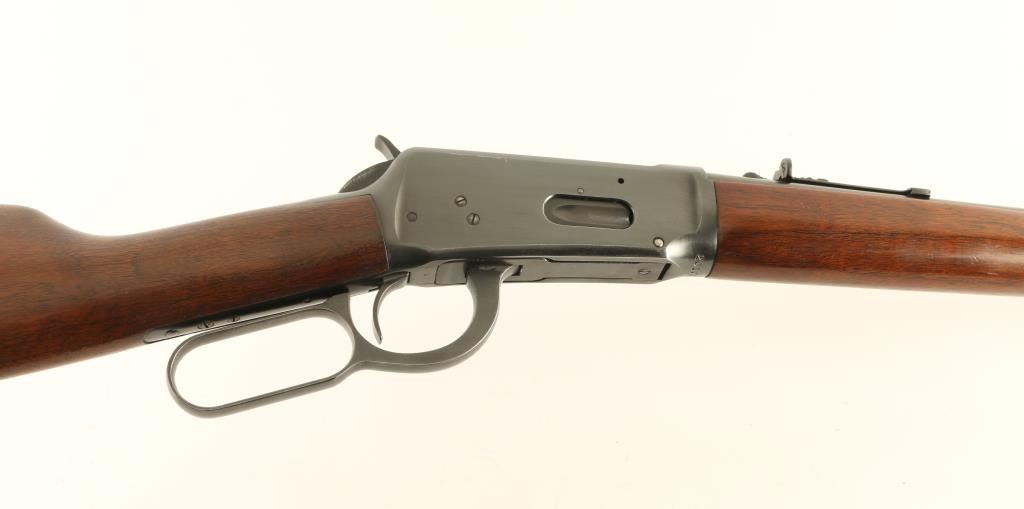 Lever action rifle manufactured circa 1954. Features blued finish, wood forend, wood butt with straight grip area, flat steel buttplate, 20" barrel, full length magazine tube under barrel, buckhorn sights, external hammer. Bore is excellent condition. Retains 90% blue, with scratches and scuffs, bare metal showing on some sharp edges. Stock is very good condition with creases and dents, some loss of finish next to buttplate. Condition is NRA Very Good ++ *** C&R Firearm ***