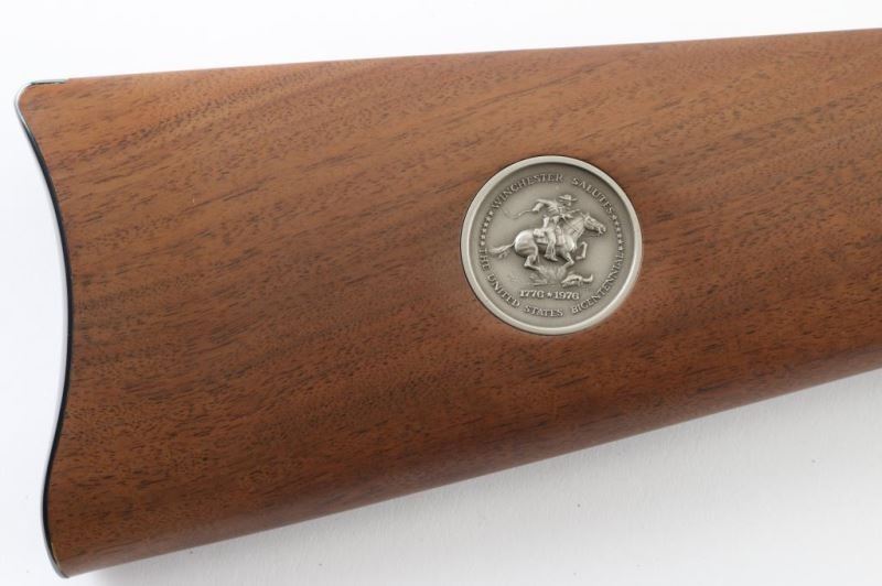 SN: USA10660 'SRC' Commemorative lever action repeating rifle celebrating 200 years of American liberty, chambered in .30-30 Winchester. One of only 19,999 produced, circa 1976. Features a blued 20" barrel, full-length 7 round magazine tube, two barrel bands, dovetailed blade front sight, adjustable rear sporting sight, smooth trigger with beveled edges, serrated hammer spur, saddle ring, antique finished receiver with rolled stamped eagle & "76" décor, checkered deluxe walnut forend with satin finish and semi-fancy figured straight grip shoulder stock with inlayed commemorative coin on the right side & smooth metal carbine buttplate. Includes the original factory two-piece styrofoam box with matching label and sleeve. Rifle retains approximately 98% of its original finish showing few minor blemishes. Action is smooth, the bore is pristine and the wood stocks are fine with minimal blemishes. Includes factory box, display rack, and (2) boxes (40 rounds) of matching Bicentennial boxed ammo. Condition is NRA Excellent *** C&R Firearm ***
