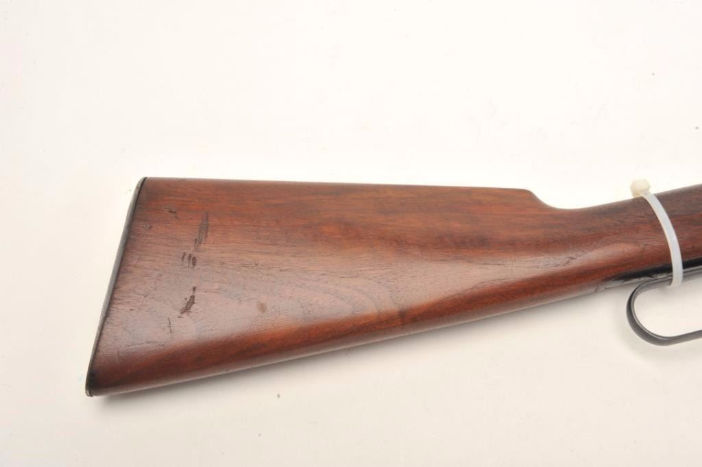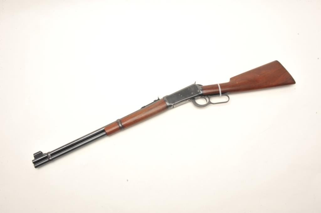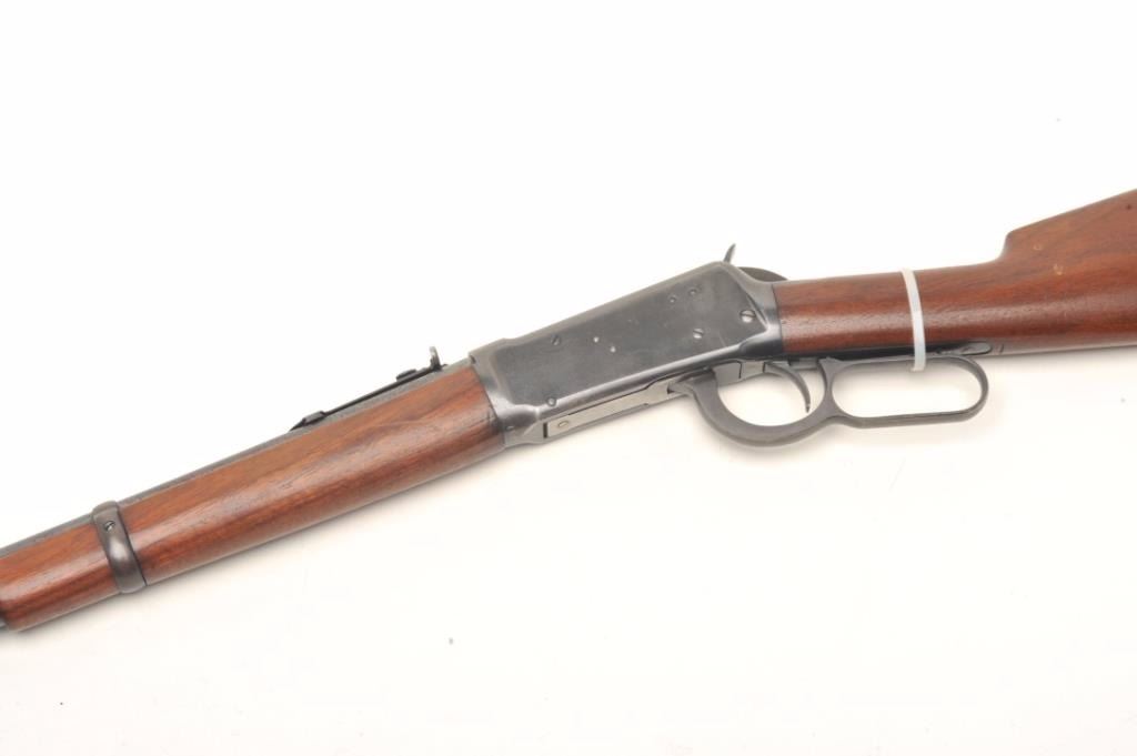 Winchester Model 94 carbine pre-war in .30-30 caliber, S/N 1135081. This rifle shows 90%-95% original blue with loses at the edges and minor scratches. Two tap holes in receiver for Lyman sight with plug screws.The wood is also very good plus with just minor scratches. A better than average 1937 made Winchester with great bore. (C&R) Est.: $500-$1000