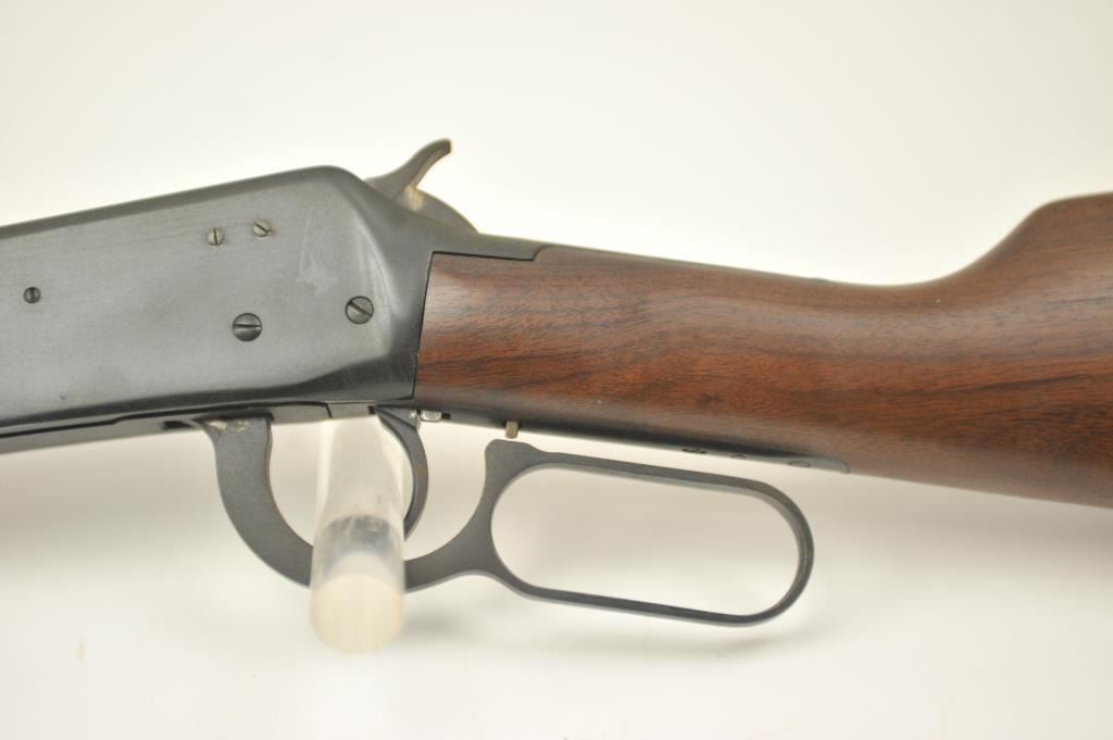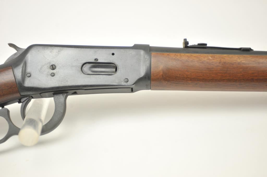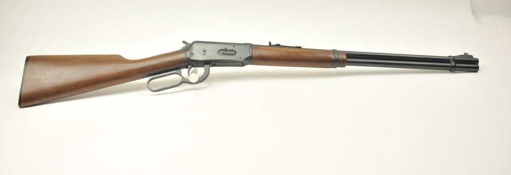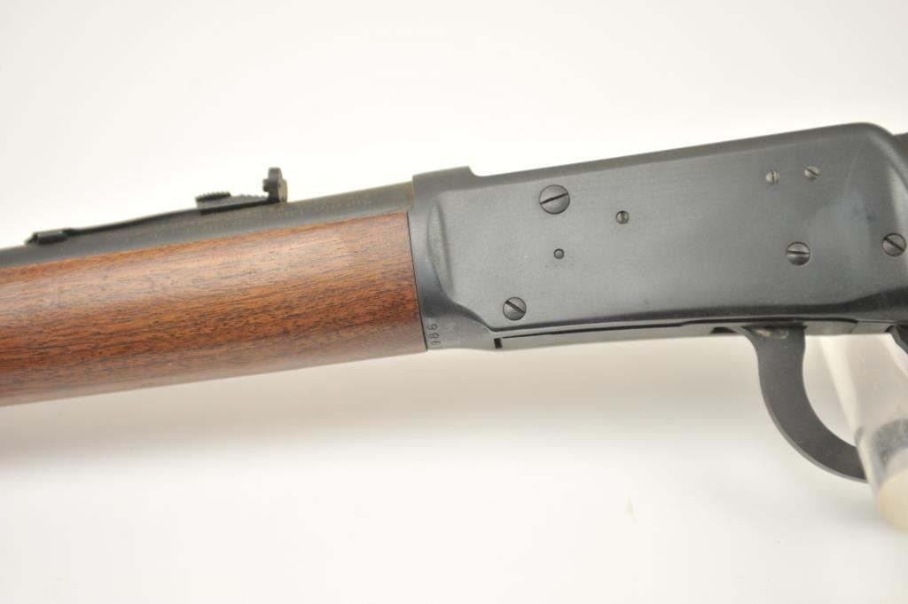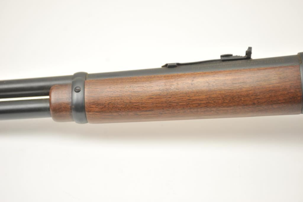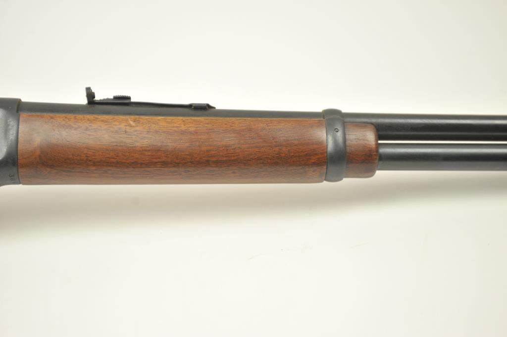 Winchester Model 94 lever action carbine, .30-30 caliber, Serial #3871986. The carbine is in very good overall condition with a 20” barrel and full-length magazine. The carbine retains the majority of the mutedblue finish with some light surface rust evident. The smooth wood stocks are in very good condition and the butt stock ends with a checkered plastic butt plate. The bore is good and the action functions well. Est.:$250-$500. (Modern).