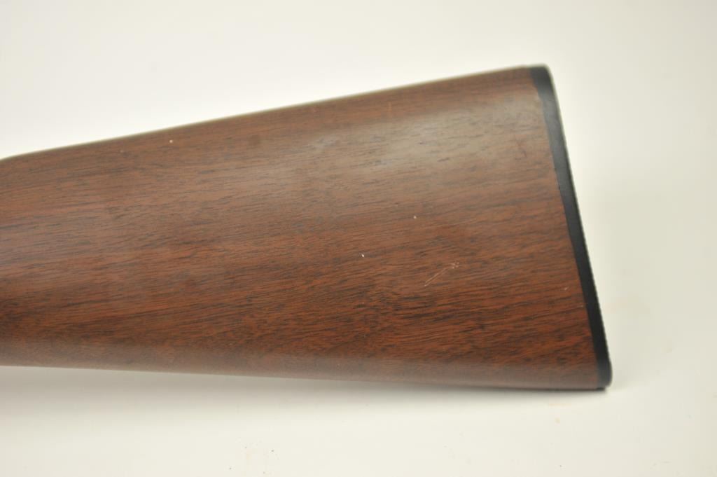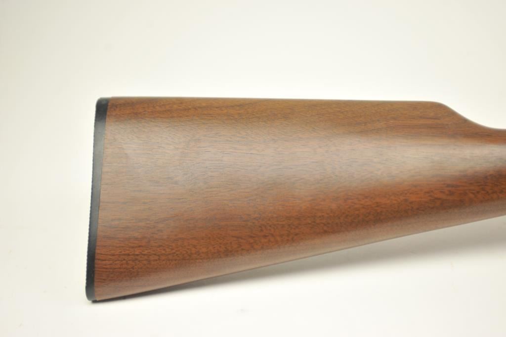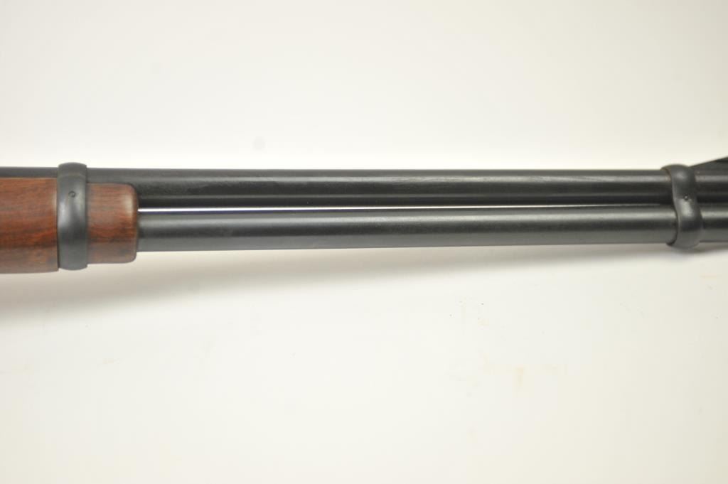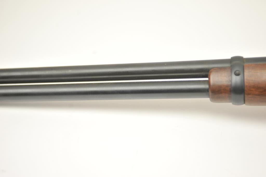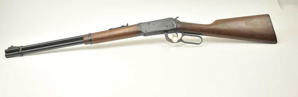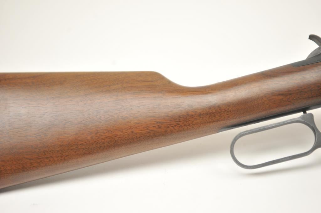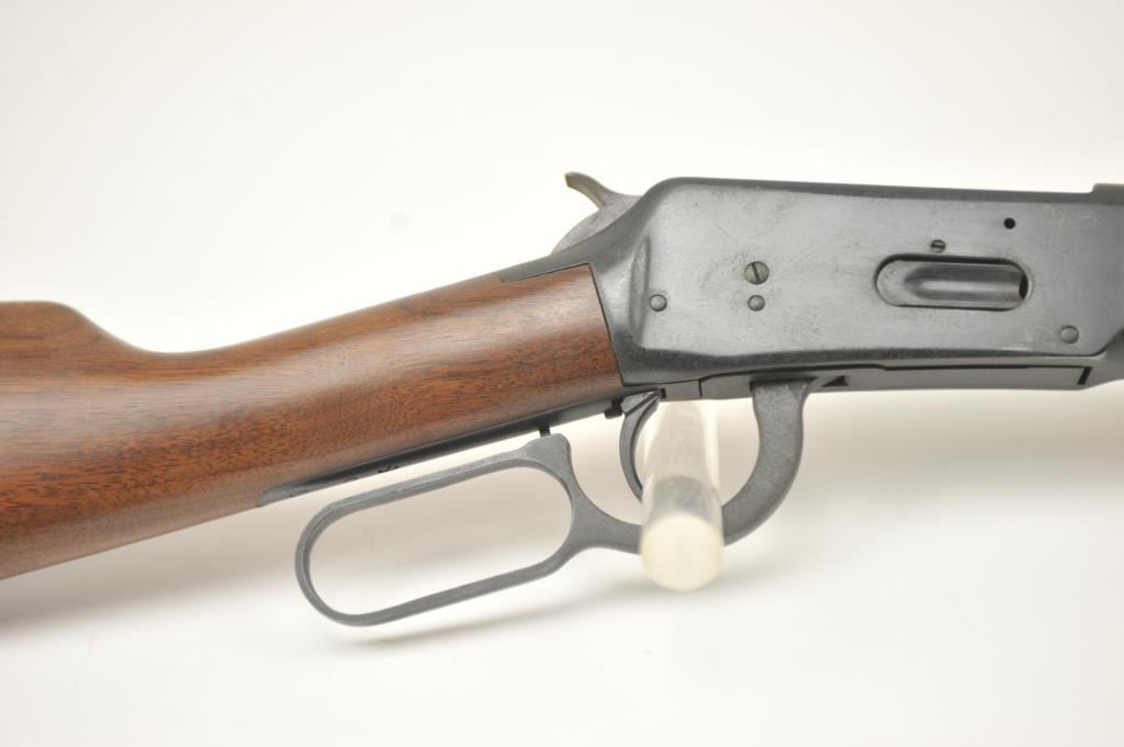 Winchester Model 94 lever action carbine, .30-30 caliber, Serial #3871986. The carbine is in very good overall condition with a 20” barrel and full-length magazine. The carbine retains the majority of the mutedblue finish with some light surface rust evident. The smooth wood stocks are in very good condition and the butt stock ends with a checkered plastic butt plate. The bore is good and the action functions well. Est.:$250-$500. (Modern).