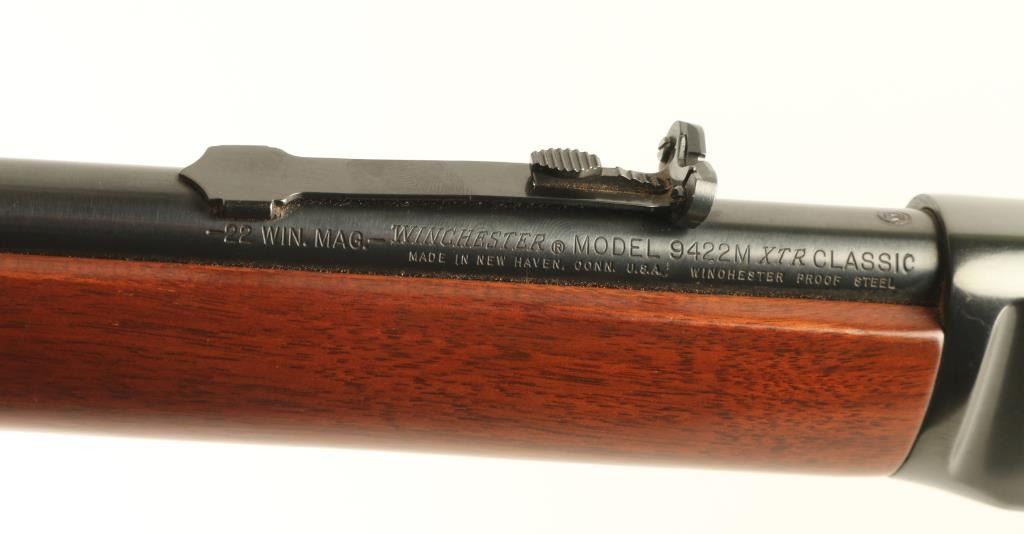 'XTR Classic' Lever action rimfire rifle features blued finish, wood forend, wood butt with curved grip, curved steel buttplate, 22" barrel, 20" long magazine tube under barrel, buckhorn sights with hooded front blade, external hammer, sling studs. Bore is excellent condition. Overall condition is excellent with few signs of handling or use, few visible dings or scratches. Condition is NRA Excellent *** Modern Firearm ***