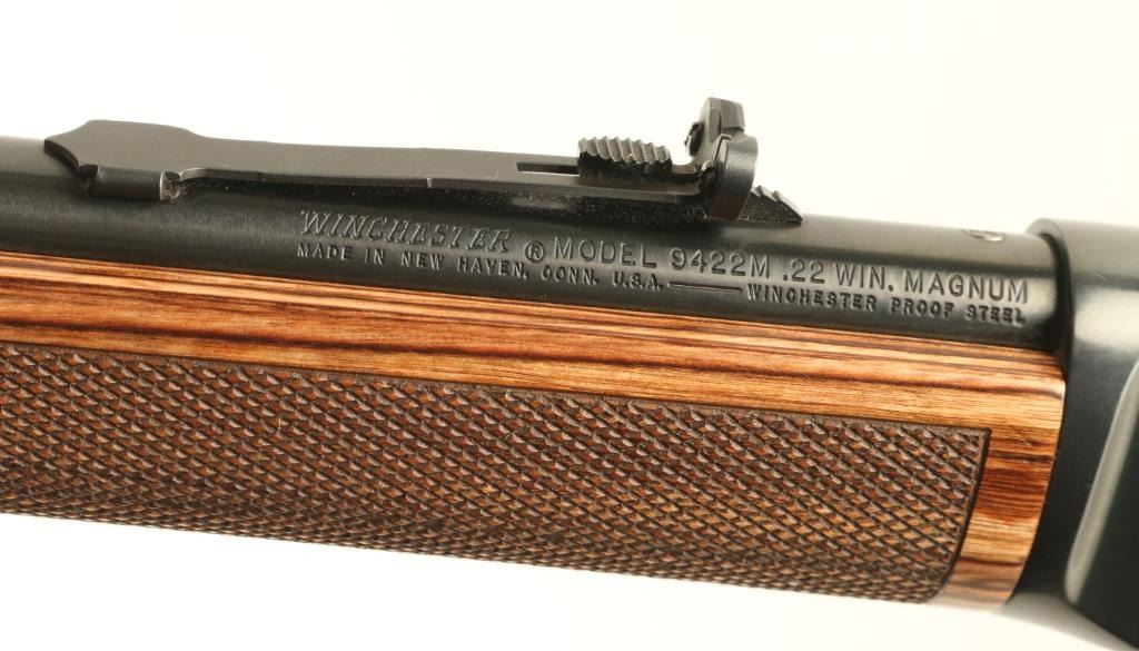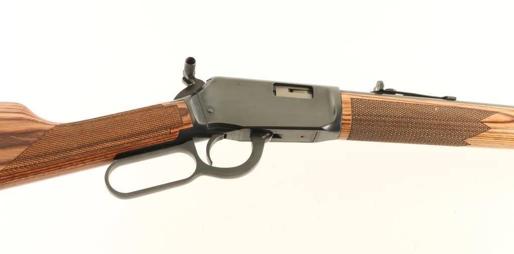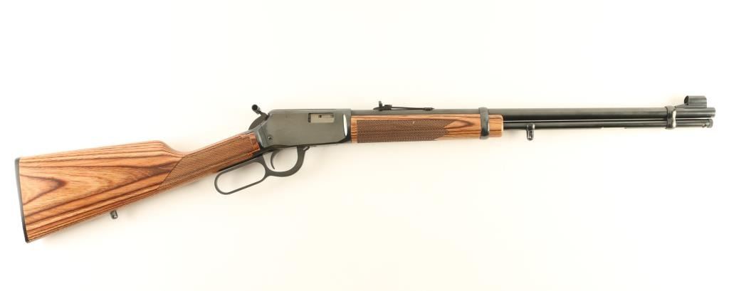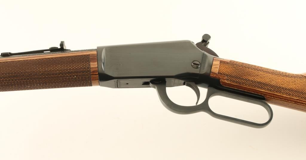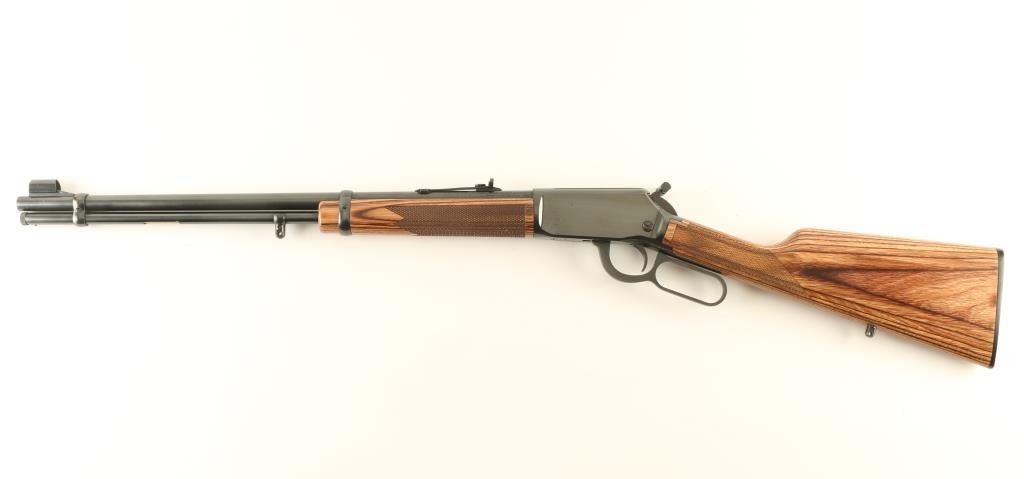 Lever action rimfire rifle features blued finish, checkered wood forend, wood butt with straight grip and checkered wrist, flat plastic buttplate, 20" barrel, full length magazine tube under barrel, buckhorn sights, external hammer, sling studs. Bore is excellent condition. Overall condition is excellent with few signs of handling or use, few visible dings or scratches. Condition is NRA Excellent *** Modern Firearm ***