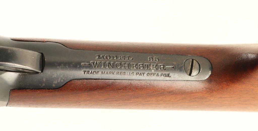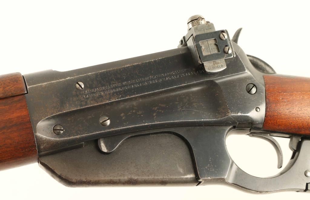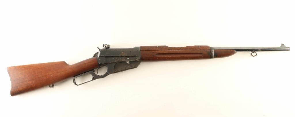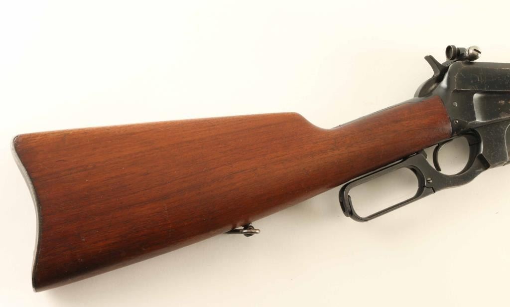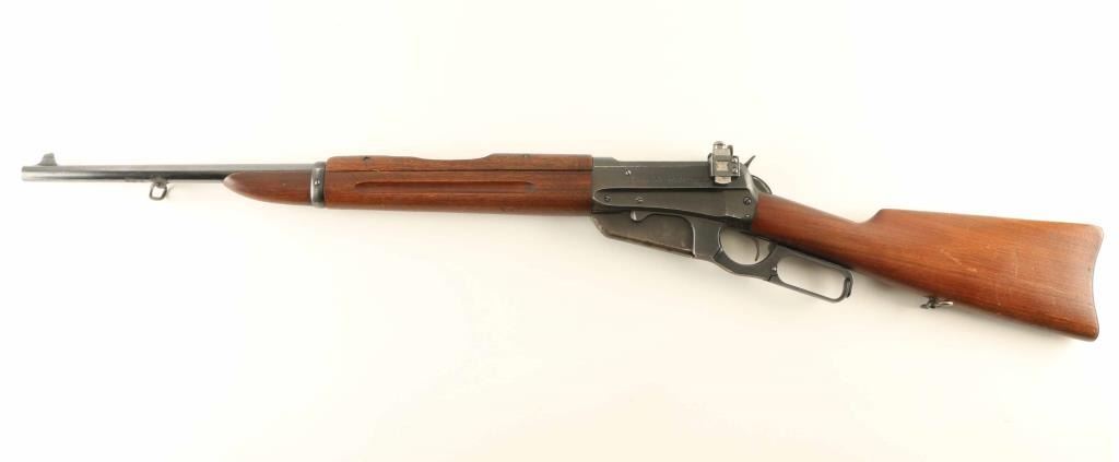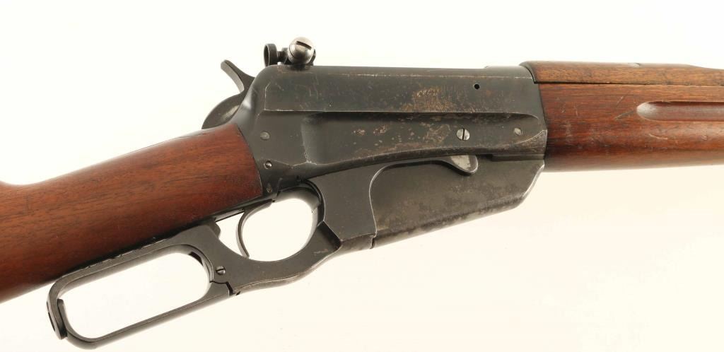 'Carbine' manufactured circa 1932 (last year of production). Features 22" barrel, blade front sight, Redfield receiver mounted rear peep sight, vertical box magazine, straight grip, curved steel carbine buttplate with sliding trap door over storage compartment, handguard over rear portion of barrel. Bore is very good condition. Retains 60% blue, scratches & scuffs, areas of patina and shallow pitting on barrel and sides of receiver, dark patina across bottom of magazine, bare metal on sharp edges and where patina has been removed. Screw slots are generally good condition. Wood is good to very good condition with small gouges and dents, good fit to metal. Markings are crisp. Lever operates smoothly. Condition is NRA Good+ *** C&R Firearm ***
