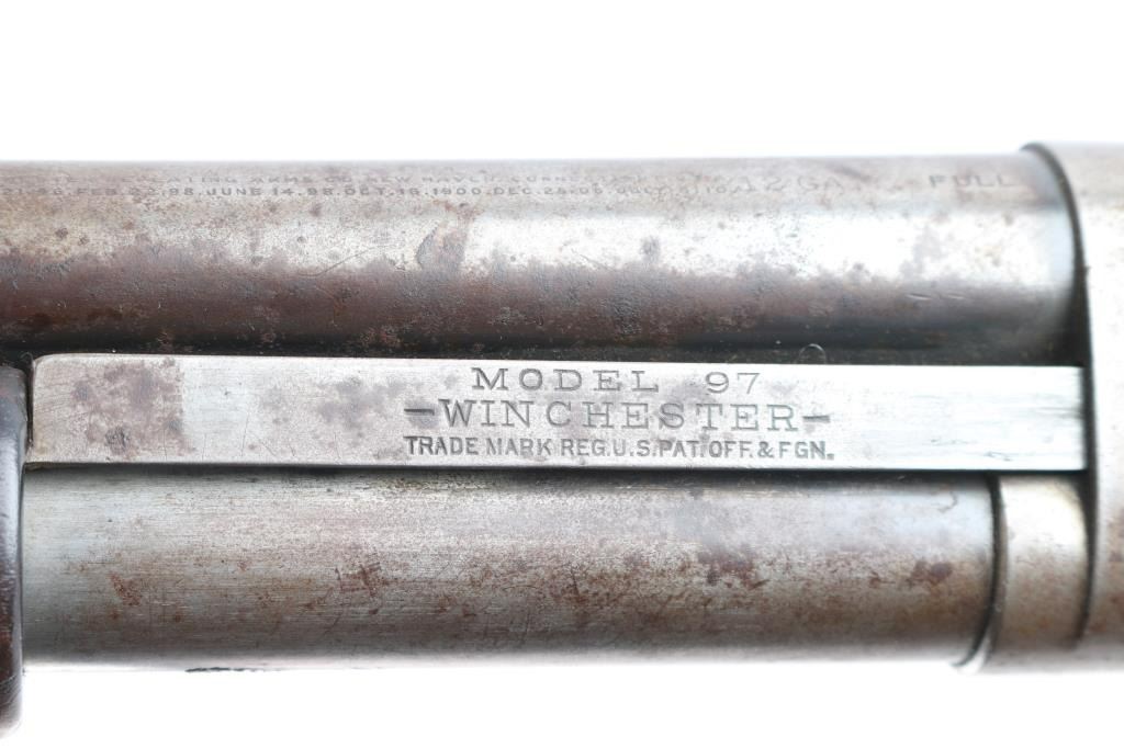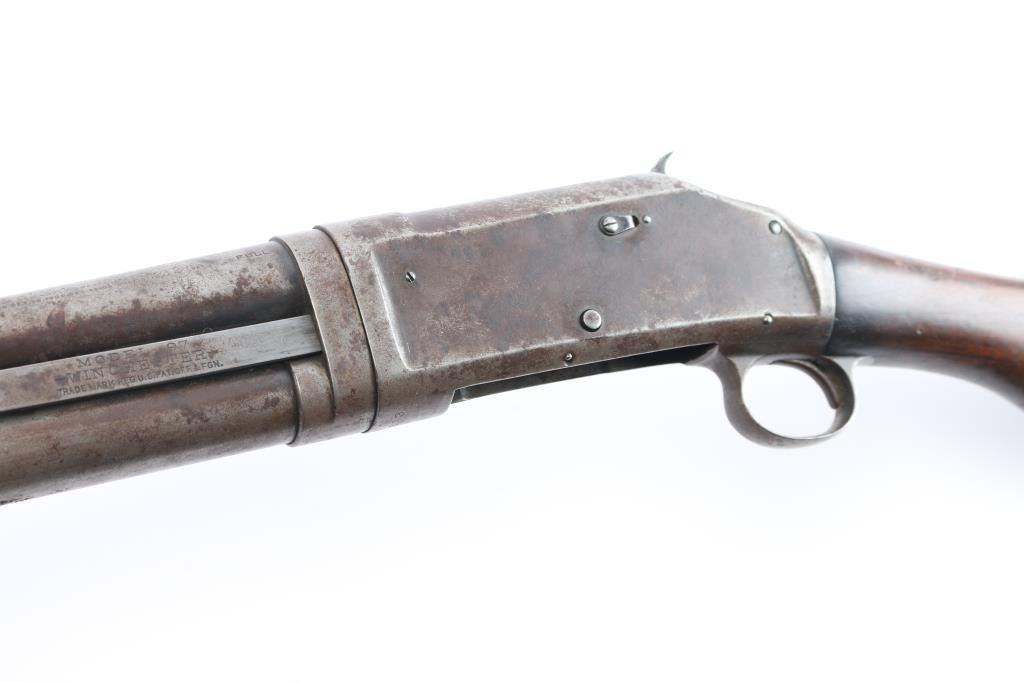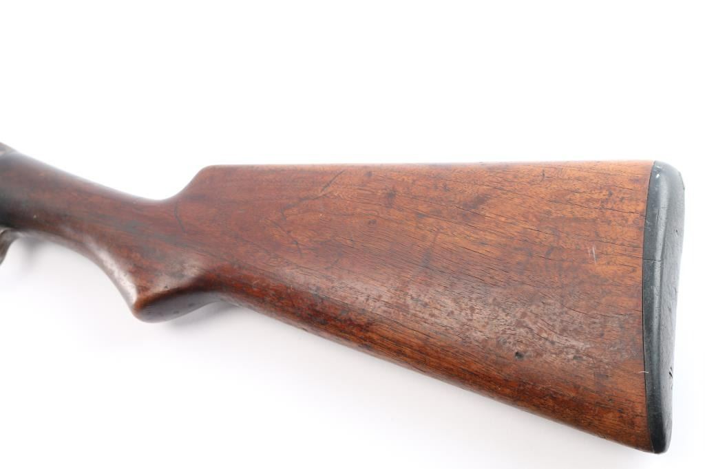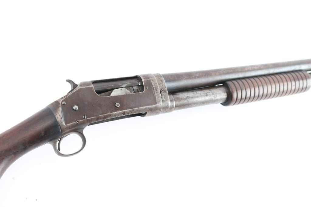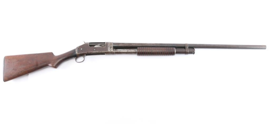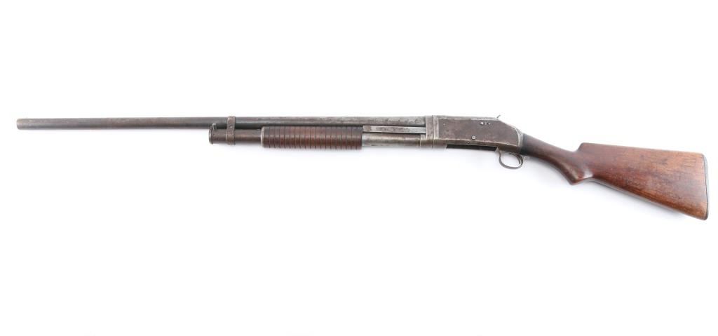 Vintage take down pump action shotgun manufactured circa 1917. Features blued finish, grooved "corn cob" walnut pump handle, smooth walnut stock with curved grip, hard rubber butt plate. plain 30" barrel with brass sighting bead, accepts 2-3/4" shells, fixed FULL choke, exposed hammer. Receiver extension numbered to receiver.(Top number is feint) LOP is 13 1/2". Bore is very good/bright. Retains none of the original blue, having turned a molted gray/brown patina, some scattered areas of very light pitting, action is a little stiff, needs oil, wood has some minor scratches/dings but sound.