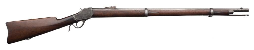 Winchester Model Hi Wall Musket, .45-70 caliber, 32” round barrel, S/N 69264, blued finish, wood stocks with three barrel bands and sling swivels; iron cleaning rod. This very scarce Winchester is in overall very good condition displaying a dark patina on metal surfaces, very good bore, crisp action, sharp markings and very good wood stocks; accompanied by a Cody Firearms Museum Records Office “white sheet” indicating gun was shipped on March 27, 1895 to order number 8080 and confirming Model and caliber; also a copy of p. 298 of Madis’ book on Winchesters mentioning this gun by serial number. Est.: $1,600-$3,200.