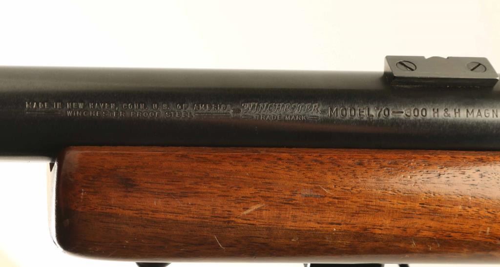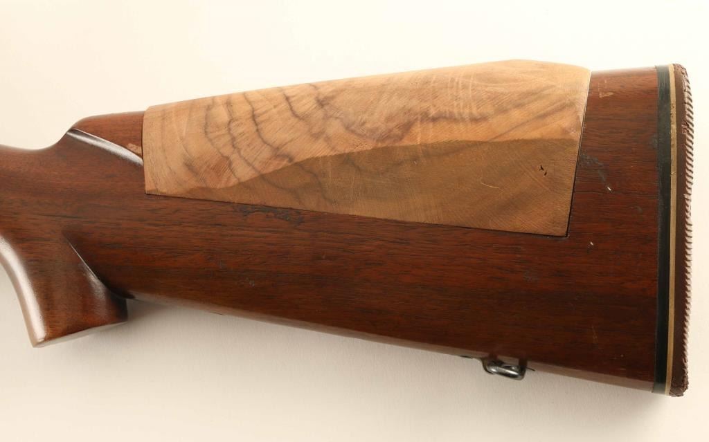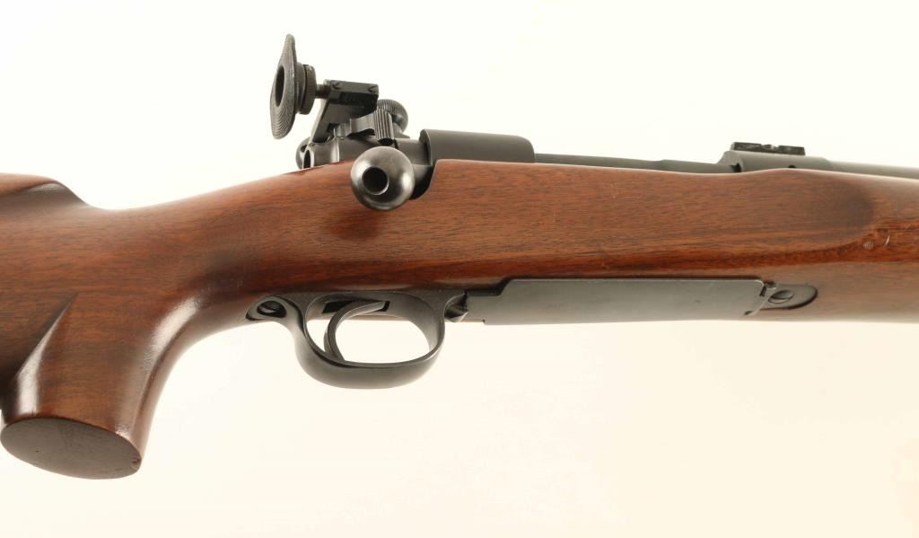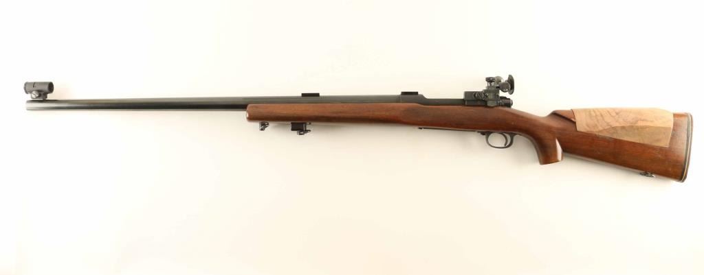 SN: 475714 Bolt action target rifle manufactured circa 1960. Features 28" heavy bull barrel, Redfield International Match adjustable target sights, dovetails on barrel and receiver ring for scope mounting (no scope included), blued finish, beavertail forend wood target stock with hand stop, hinged floorplate, manual safety, sling swivels, brown plastic buttplate. Bore is very good to excellent condition. Retains 85% blue, with scuffs and scratches, signs of use. Stock has had a section of the comb removed and replaced with a unfinished replacement block, needs to be contour matched and finished, fit is poor. Includes small collection of inserts for hooded front sight. Condition is NRA Very Good *** C&R Firearm ***