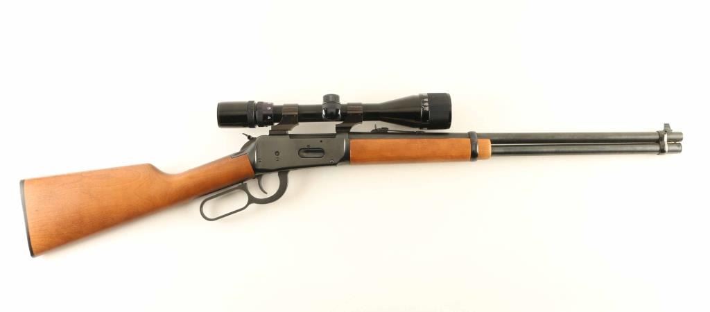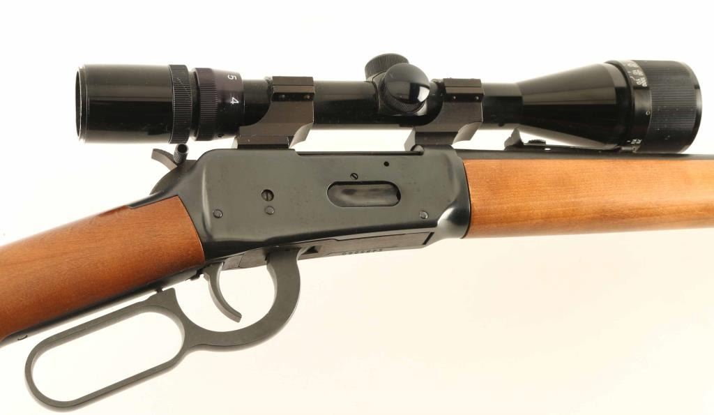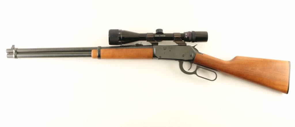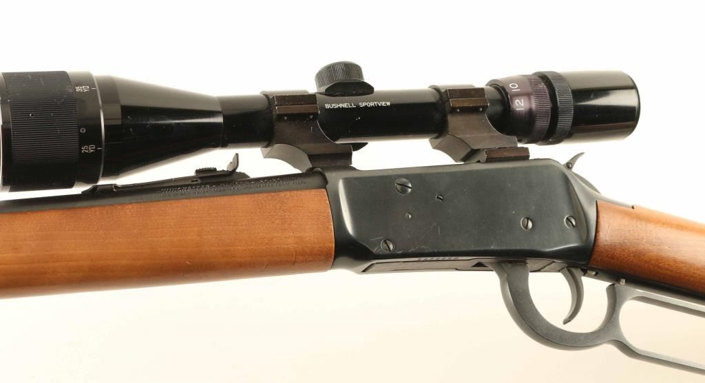 Rifle. Lever-Action. 20" barrel, with open iron sights. Smooth walnut stock, and forearm. Bore appears excellent/bright. Action is crisp/tight. Wood is very good with some minor scratches. Blued finish is about 98% with some minor scratches, and pin-prick surface rust. Mounted with a Bushnell Sportsview scope. Hammer extension attached. NRA Condition-Very Good. Modern Firearm.