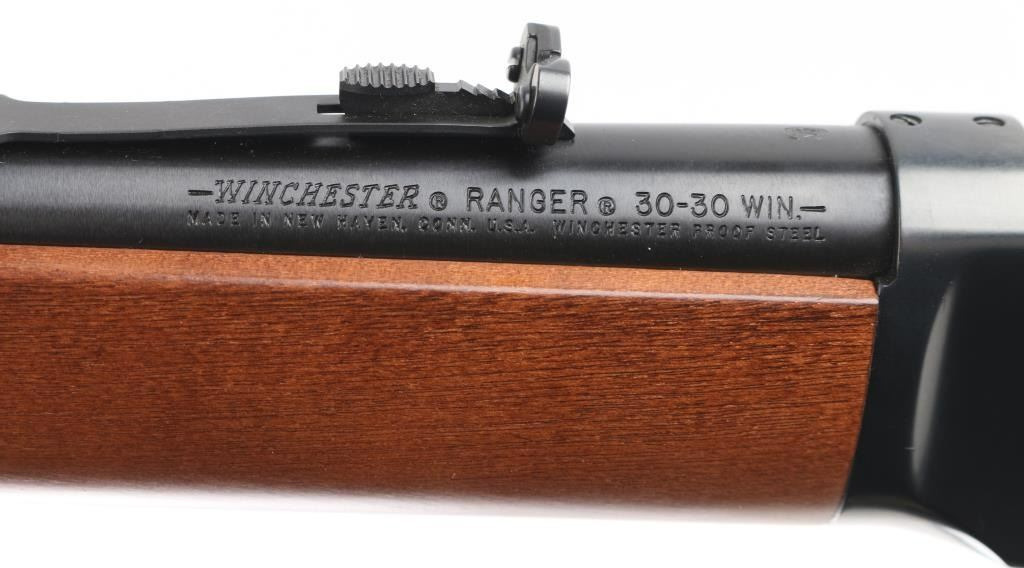 Lever action rifle features blued finish, smooth wood forend & straight gripped stock, plastic buttplate, 20" barrel, blade front & sporting rear sights, tube magazine under barrel, manual cross bolt safety, angle eject receiver, side extension lever threaded into hammer. Bore is excellent condition. Retains 95% blue with few handling. Wood is very good to excellent condition. Condition is NRA Excellent *** Modern Firearm ***
