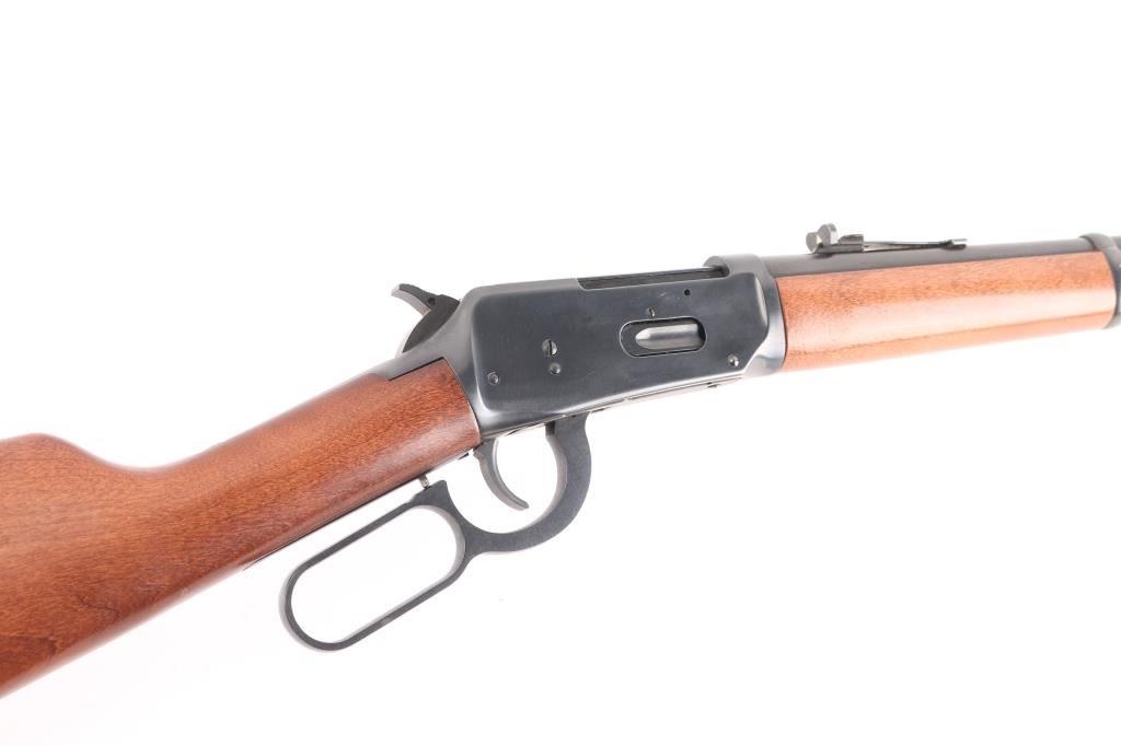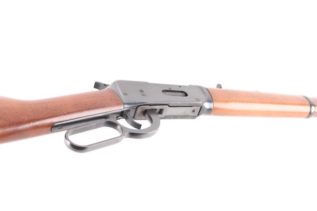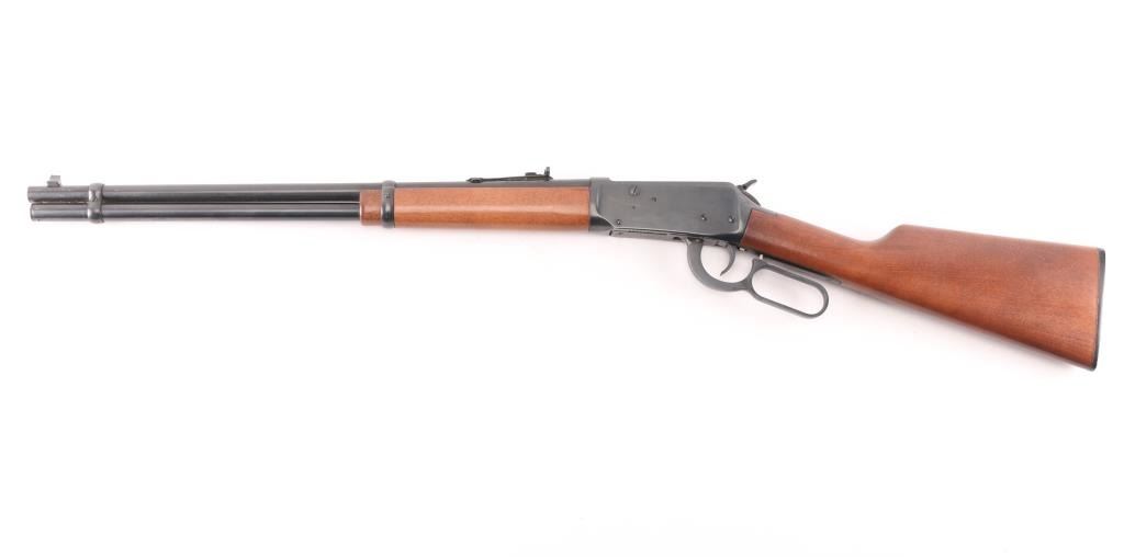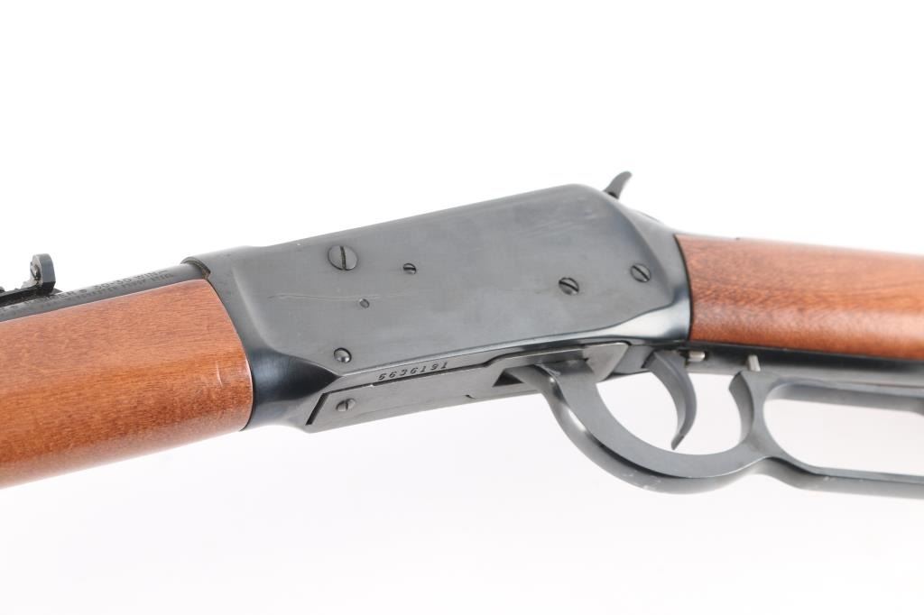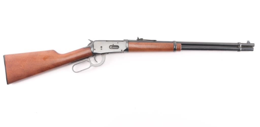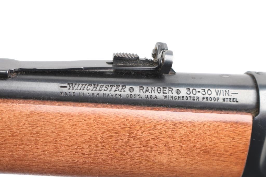 Lever-Action carbine. Angle eject economy variation of the 94. 20" barrel with full length tube magazine. Post/bead front (The bead is broken off the blade), and semi-buckhorn rear sights. Blued finish. Straight birch stock, forearm. Black plastic "Winchester" buttplate. Standard Winchester markings on barrel. Winchester proof. Receiver has been drilled/tapped for optics. Action is crisp/tight. Bore is very good/bright. Blued finish is about 98% with minor scratches. Wood is excellent/sound. Would be excellent if not for sight.NRA condition-Fair to Good. Modern Firearm.