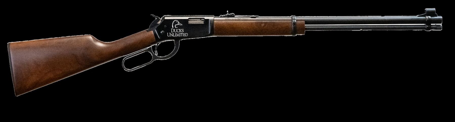 This lever-action .22LR rifle features a sleek walnut stock with a satin finish and a 20.5-inch barrel. It also boasts a specially engraved receiver adorned with the DU logo, making it a stylish addition to any collection.