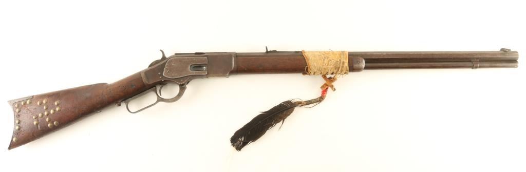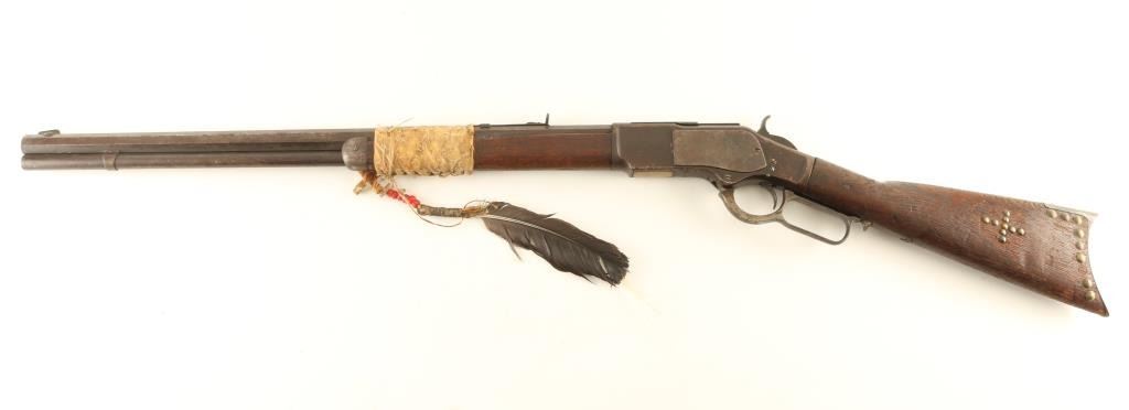 Indian used antique lever action repeating rifle chambered in .44-40 Winchester, manufactured in New Haven, CT circa 1879-1882. Features a 24 5/16" octagonal barrel, dovetailed large blade front sight, elevation adjustable semi-buckhorn rear sporting sight, full-length magazine tube, smooth trigger, knurled hammer spur, sliding dust cover with serrations on the rear, grip safety, smooth walnut forend with metal cap and straight grip shoulder stock with crescent trapdoor buttplate. Shows features commonly seen on Indian used guns such as an obliterated serial number, repaired stock, brass tack embellishments on the butt and hide wrap on the forend/barrel with dangling beads & feather. Rifle displays an aged brown patina with some traces of finish in the protected areas on the receiver. Action is in good working order, the bore is very good and the wood stocks are fair. Condition is NRA Good. ***Antique Firearm***