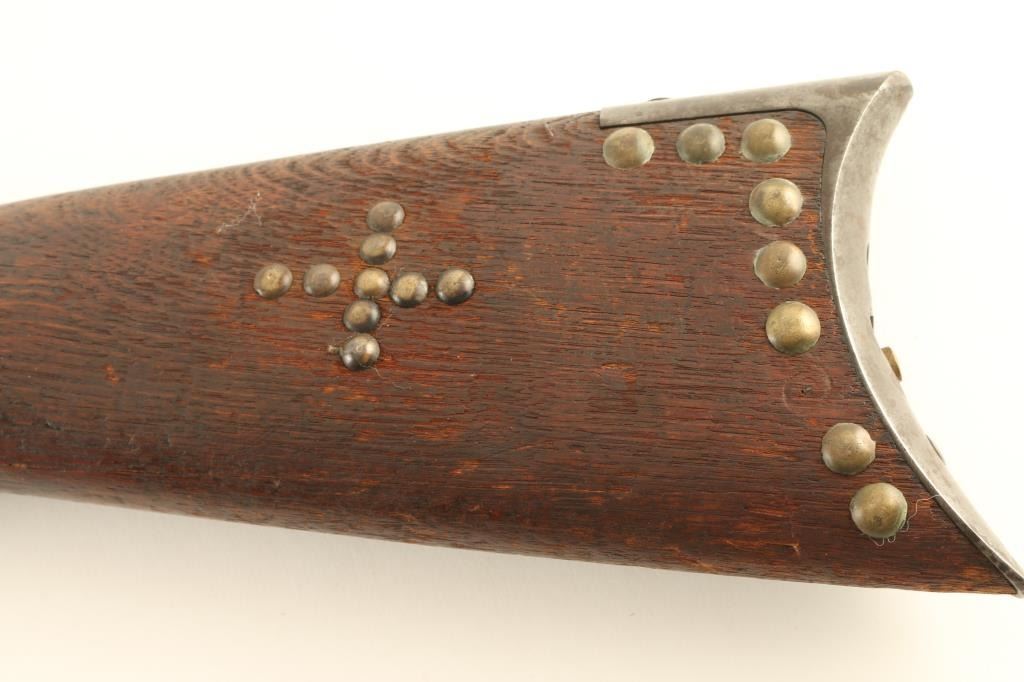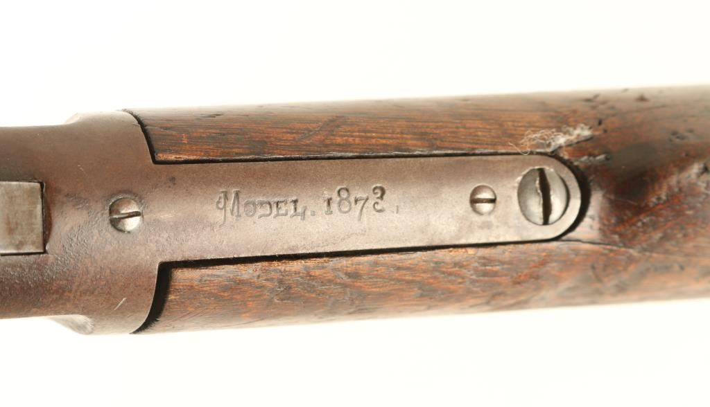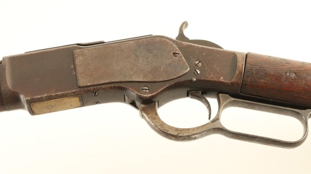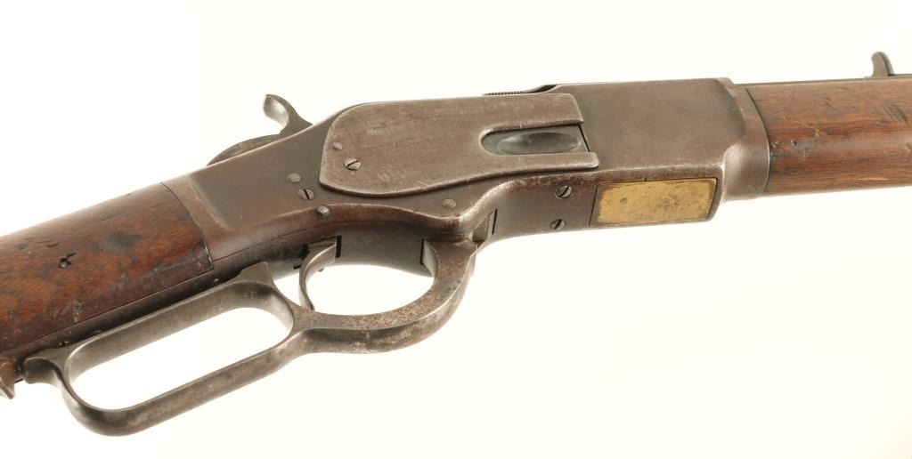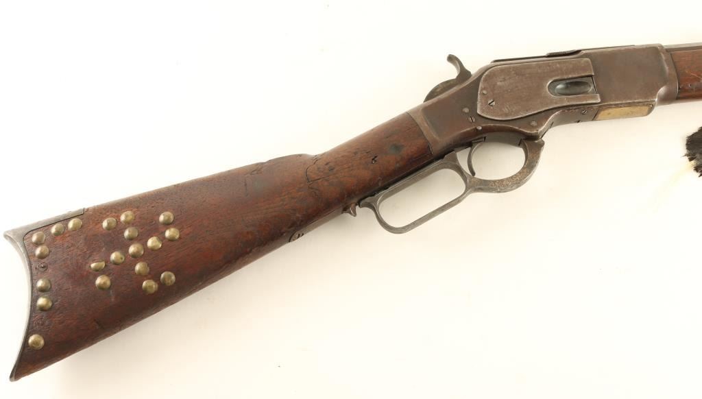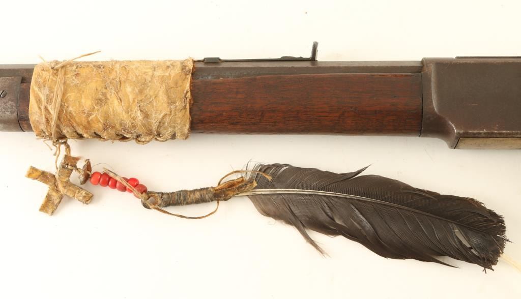 Indian used antique lever action repeating rifle chambered in .44-40 Winchester, manufactured in New Haven, CT circa 1879-1882. Features a 24 5/16" octagonal barrel, dovetailed large blade front sight, elevation adjustable semi-buckhorn rear sporting sight, full-length magazine tube, smooth trigger, knurled hammer spur, sliding dust cover with serrations on the rear, grip safety, smooth walnut forend with metal cap and straight grip shoulder stock with crescent trapdoor buttplate. Shows features commonly seen on Indian used guns such as an obliterated serial number, repaired stock, brass tack embellishments on the butt and hide wrap on the forend/barrel with dangling beads & feather. Rifle displays an aged brown patina with some traces of finish in the protected areas on the receiver. Action is in good working order, the bore is very good and the wood stocks are fair. Condition is NRA Good. ***Antique Firearm***