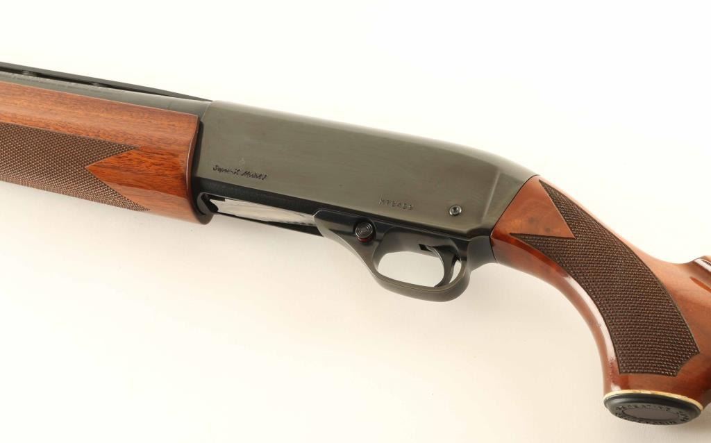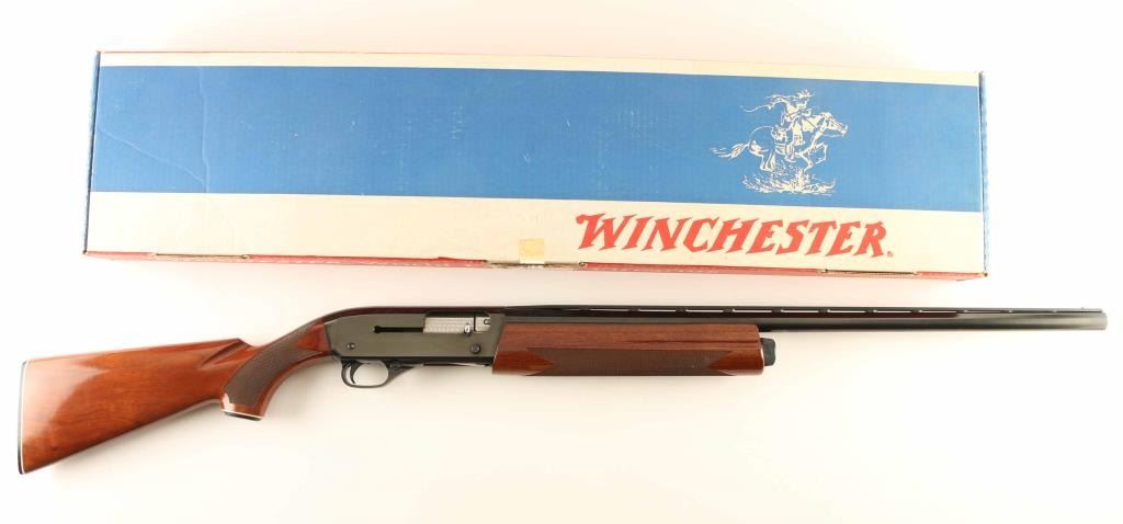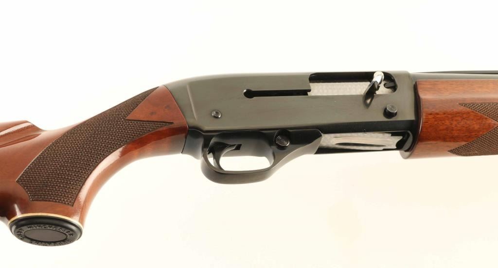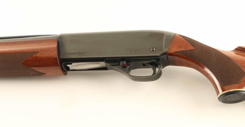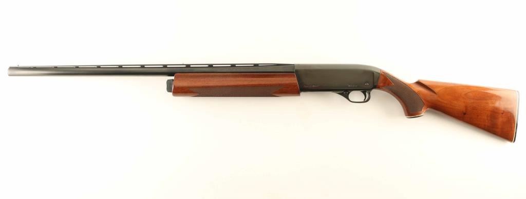 Semiautomatic shotgun features blued finish, urethane finished wood, checkered forend & wrist, curved grip stock with plastic buttplate, 26" vent rib barrel with steel front bead, Improved Cylinder fixed choke, manual safety. Accepts 2-3/4" shells. Bore is excellent. Metal retains 95% blue with handling marks. Wood is excellent condition with few small dents and scuffs on stock. Includes factory box, manual. Condition is NRA Excellent *** Modern Firearm ***