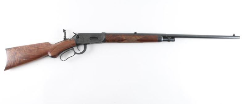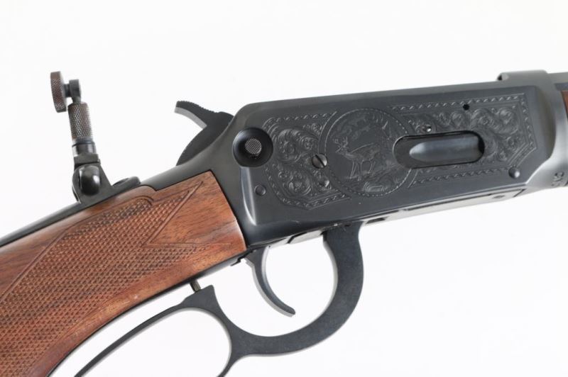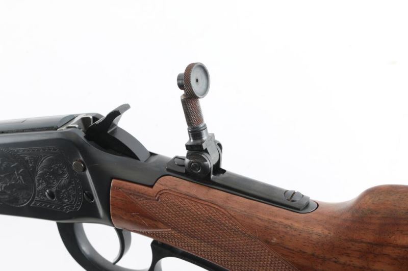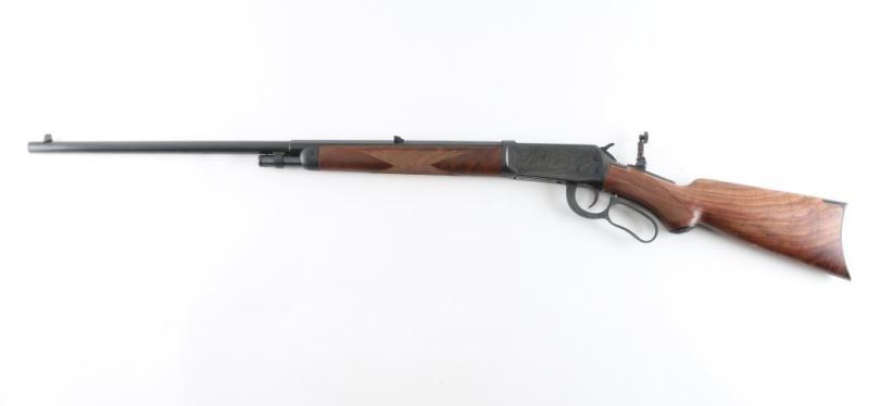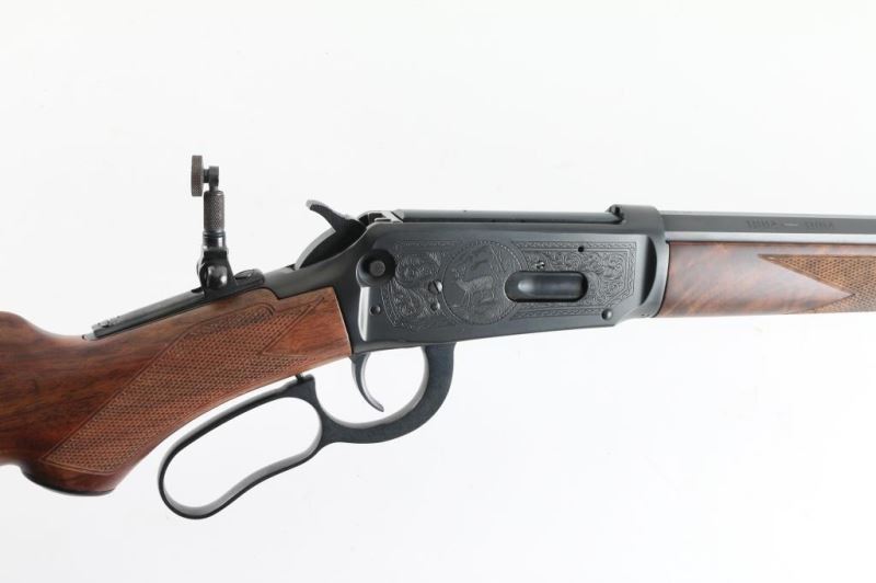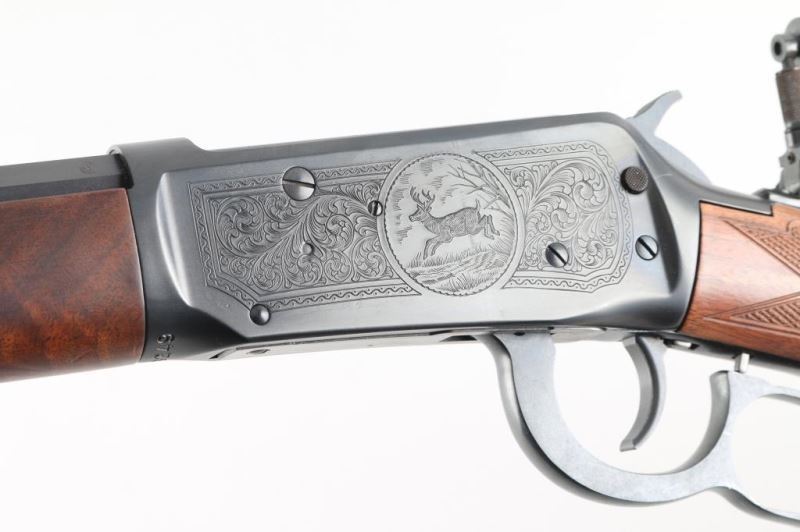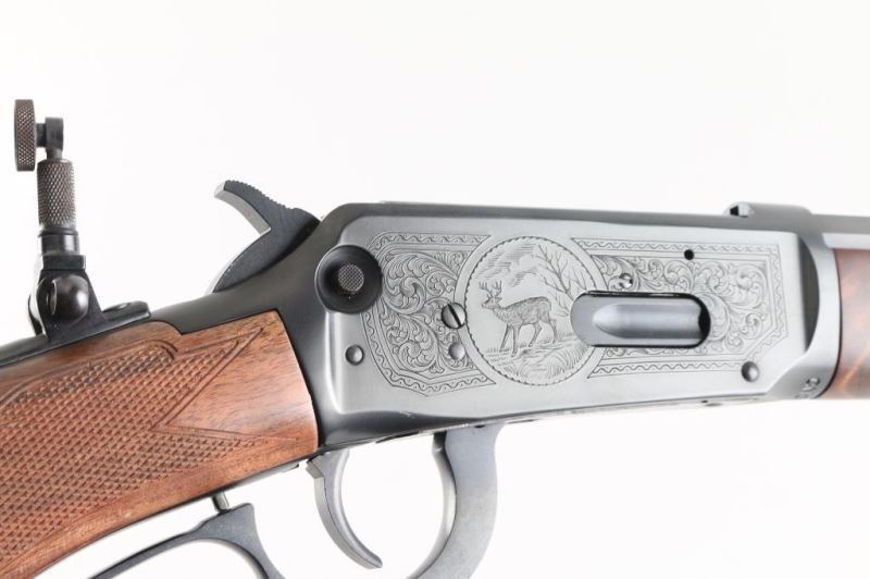 Rifle. Lever-Action. Limited edition Centennial rifle manufactured in 1994. Grade 1. 26" half round, half octagon barrel with post/bead front and white triangle flip u-notch rear sights. Lyman peep sight on tang, sight has some surface rust. Cross-bolt safety. Half tube magazine. U.S. repeating Arms co. address on barrel, with "Winchester Proof steel" with Cal. and proof mark on barrel. Right barrel stamped "1894-1994". Factory engraved receiver with Wild land deer scenes and scroll work. Checkered walnut stock and forearm. Grip cap marked "Winchester 1894-1994". Blued crescent steel butt plate. Bore is very good, bright. Action is smooth/tight. Blued finish is about 99% with minor scratches. Wood is very good some scratches/dings, including a scratch on right side of butt that shows bare wood. NRA Condition-near Excellent Modern Firearm.