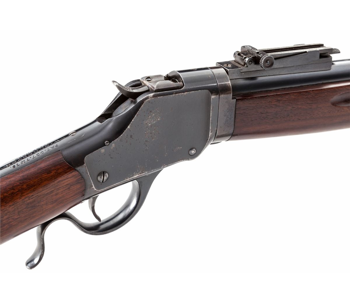 Winchester Winder 2nd Type Single Band Takedown Musket, #118623, .22 LR cal., 28'' barrel, blue finish, walnut stock and fingergroove forend, with non-standard front sight blade. Mfg'd post-WWI. Condition is excellent retaining approx. 92%-94% factory blue with losses predominantly to frame as high edgewear and moderate speckling to right side. Stocks are excellent with only light marks from handling. Steel buttplate has thinned and toned to about 50% of its original finish. Action is crisp, bore is bright. Est.: $1,200-$1,800. (C&R)