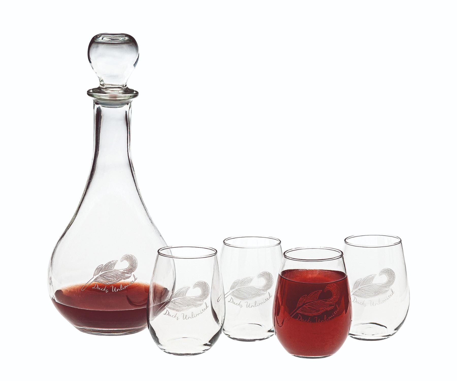 This five-piece set includes a 42oz glass wine carafe with stopper and four 8oz stemless wine glasses. Each piece features an etched feather with Ducks Unlimited script underneath. The set is housed in a DU logo storage box.