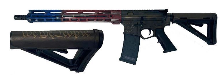 MIL SPEC FORGED UPPER AND BILLET LOWER RECEIVERS, 16" BARREL, BLACK NITRIDE M 16 BCG, MAGPUL MOE STOCK, 16" FREE FLOATING RAIL SYSTEM, I "30 ROUND MAGAZINE, CHAMBERED IN 5.56. CHRAKOTED WE THE PEOPLE DESIGN.
