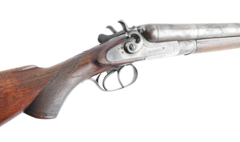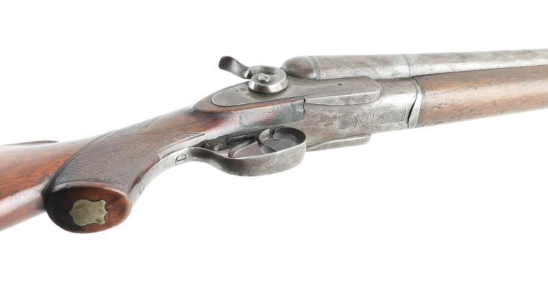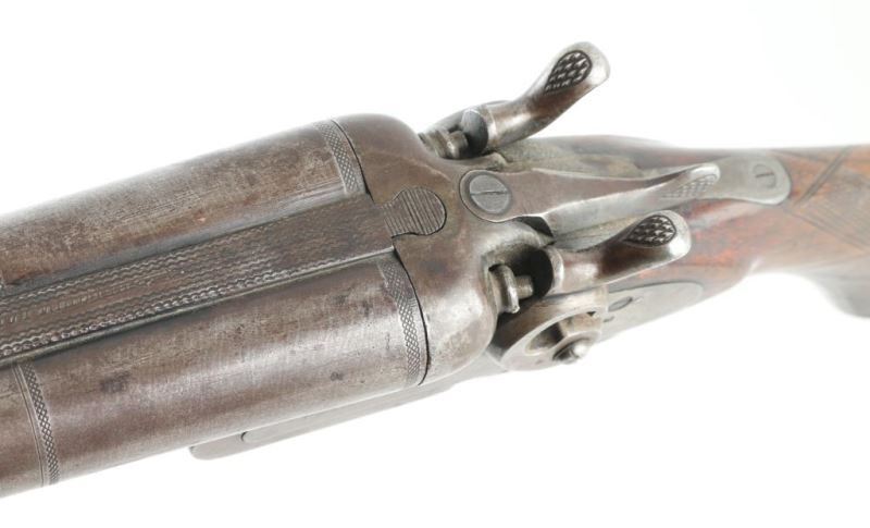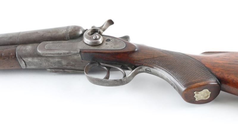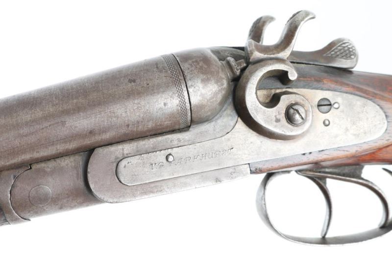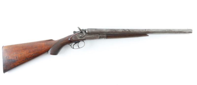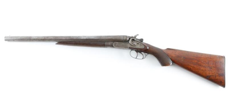 Shotgun. SXS. Wm. Parkhurst Laminated Steel is a trade name used on shotguns by by Simonis, Janssen, Dumoulin and Co. of Liege, Belgium in the period 1883-1894. Sold in the American mail order, hardware, and sporting goods markets in the late 1800'S. 18.5" barrels. Lock plates marked "Wm Parkhurst", and "Machine Made". Barrels marked "Belgium Laminated Steel". Exposed triggers, double triggers. Steel buttplate. Bores are good, with slight pitting in the chambers. Barrels lock up tight. Extractors a little loose. Hammers lock up tight, but the right hammer is a little loose. Metal finish has turned to a dull gray patina, with spots of surface rust. European hardwood stock/forearm have numerous scratches/dings, but sound. There is a shield on the grip cap. NRA Condition-Near Good. Antique Firearm.
