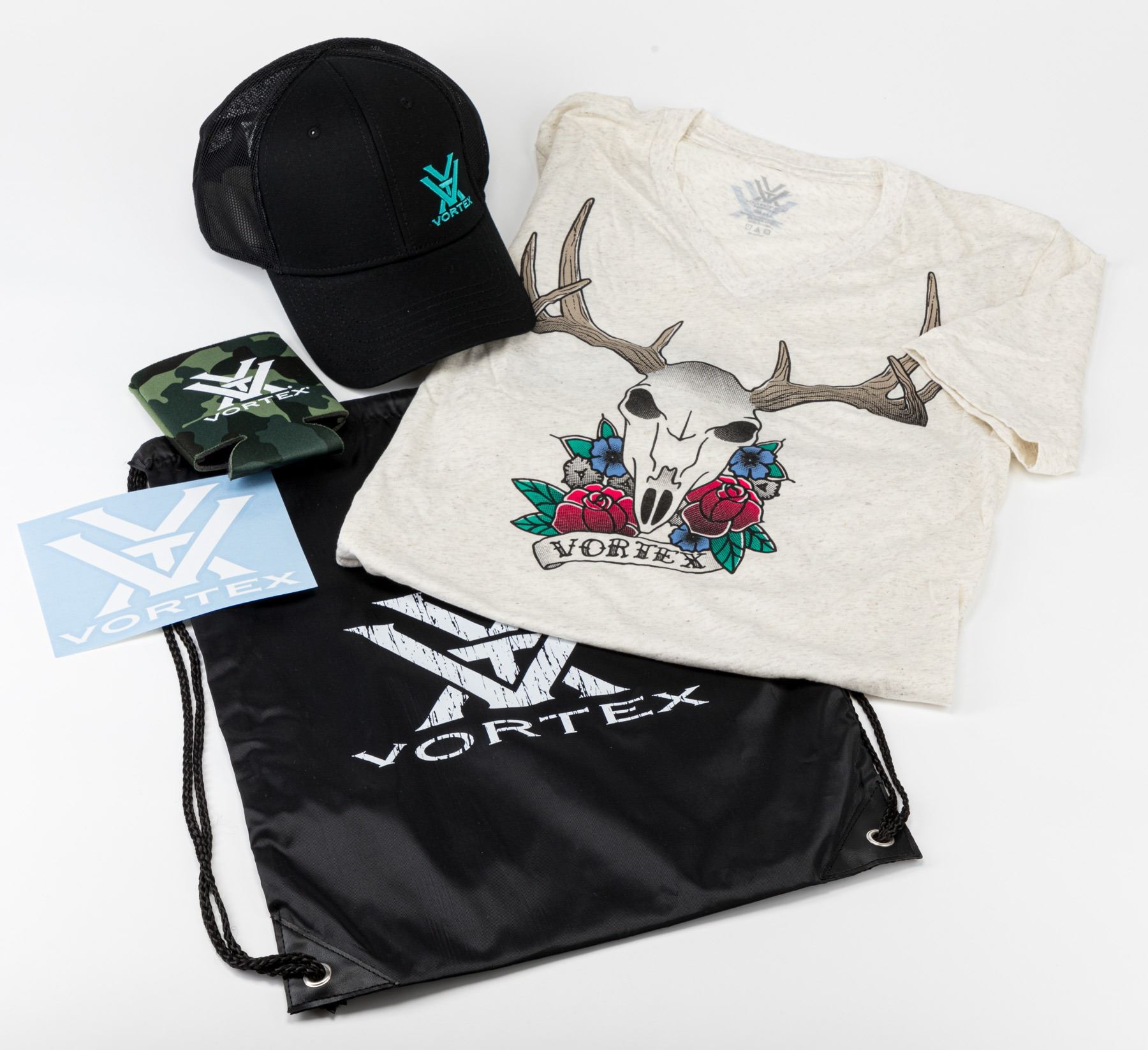 Vortex ladies sm skull tee, Ladies cap, koozie, drawstring bag and sticker
