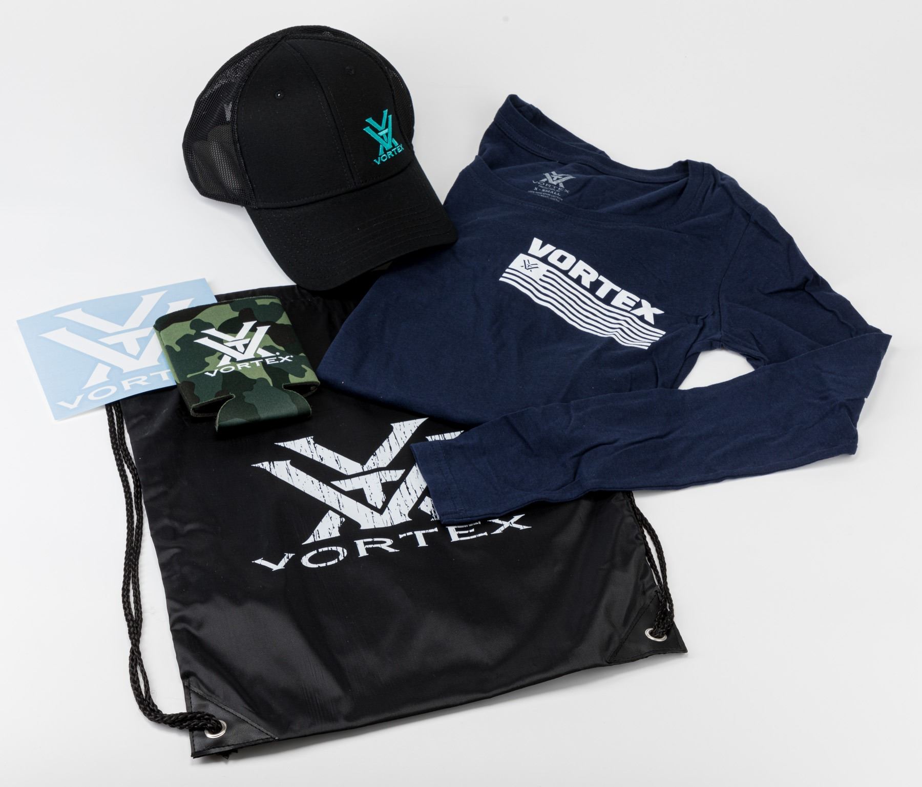 Vortex ladies x small long sleeve blue tee, Ladies cap, koozie, drawstring bag and sticker