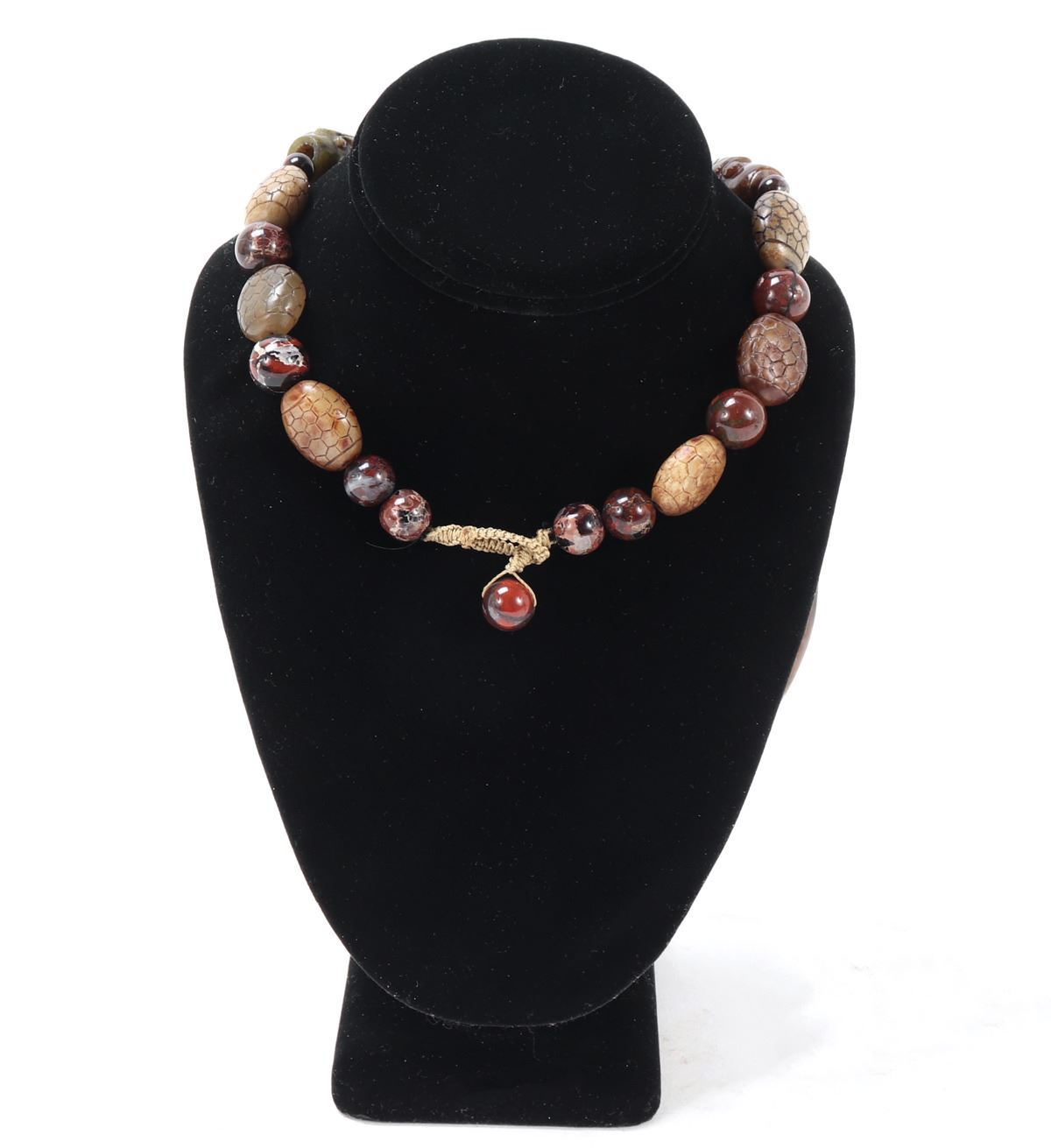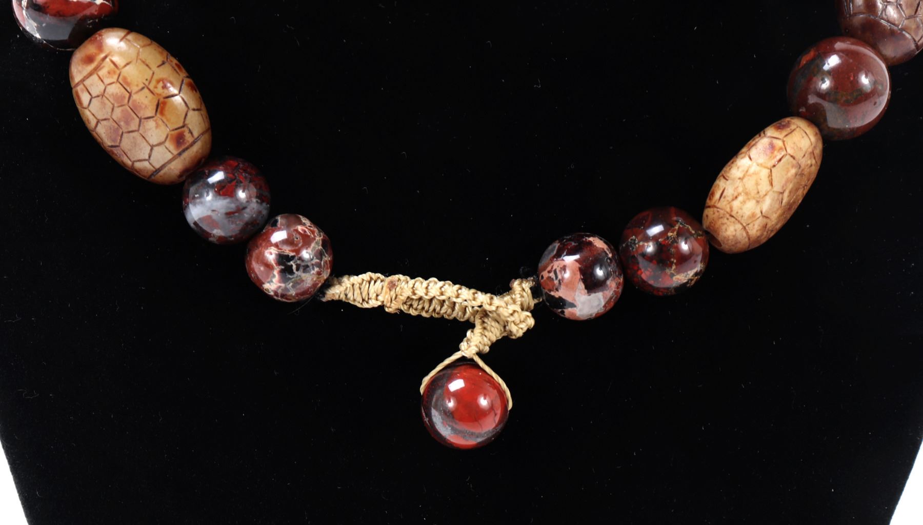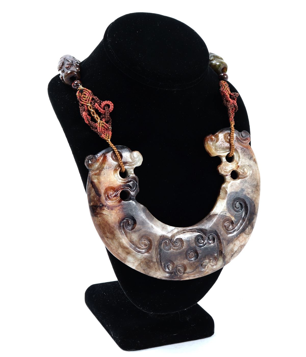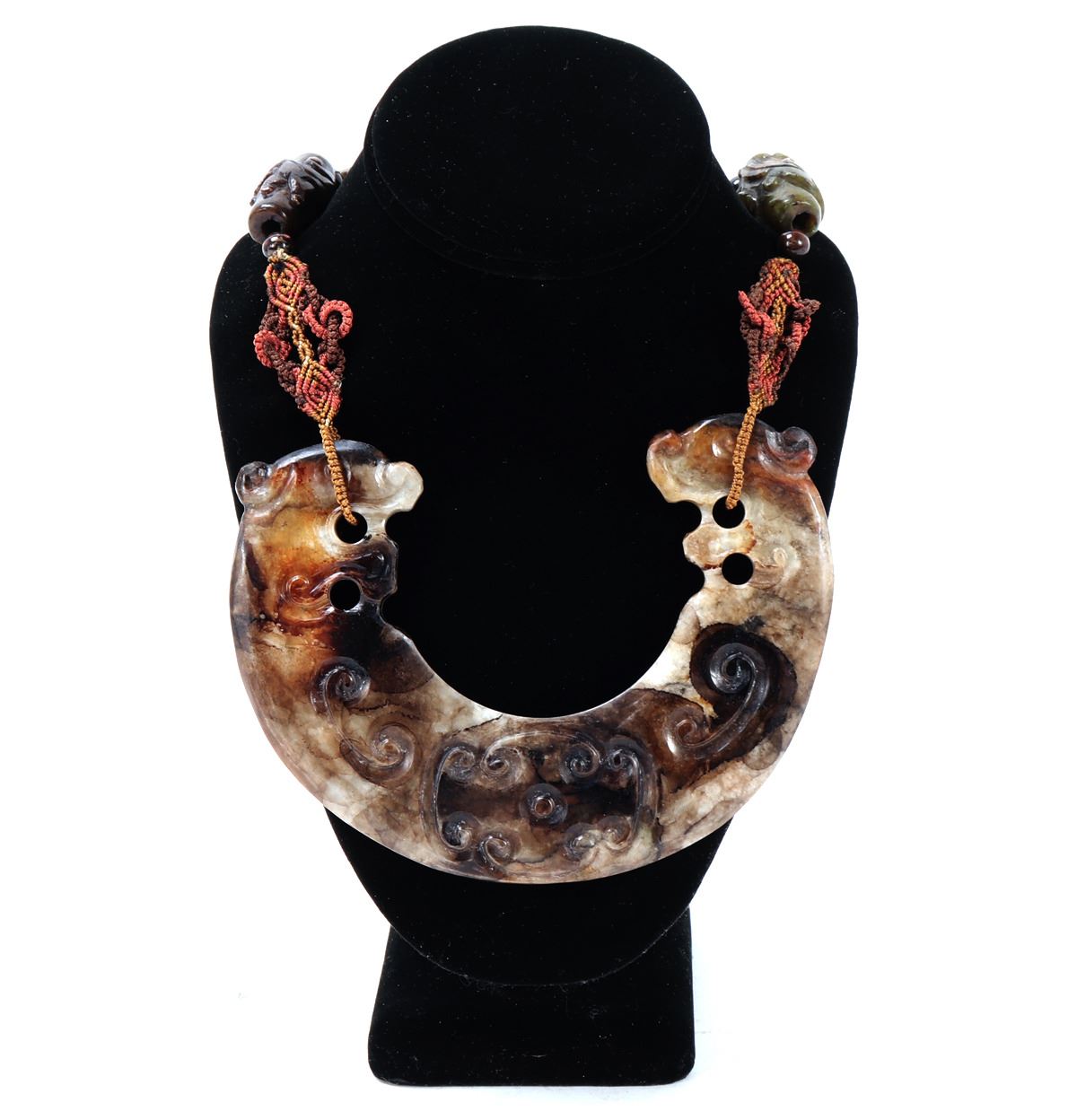 Well crafted Chinese hardstone necklace with various shaped beads throughout including incised dragon scale style beads, dragons in high relief, as well as red jasper style spacer beads throughout. Main pendant depicts a pair of zoomorphic beasts facing off. Size necklace 18 1/2" L, pendant 4 3/8" H x 5 3/4" W, 323 g. Condition: Well preserved and wearable condition throughout.