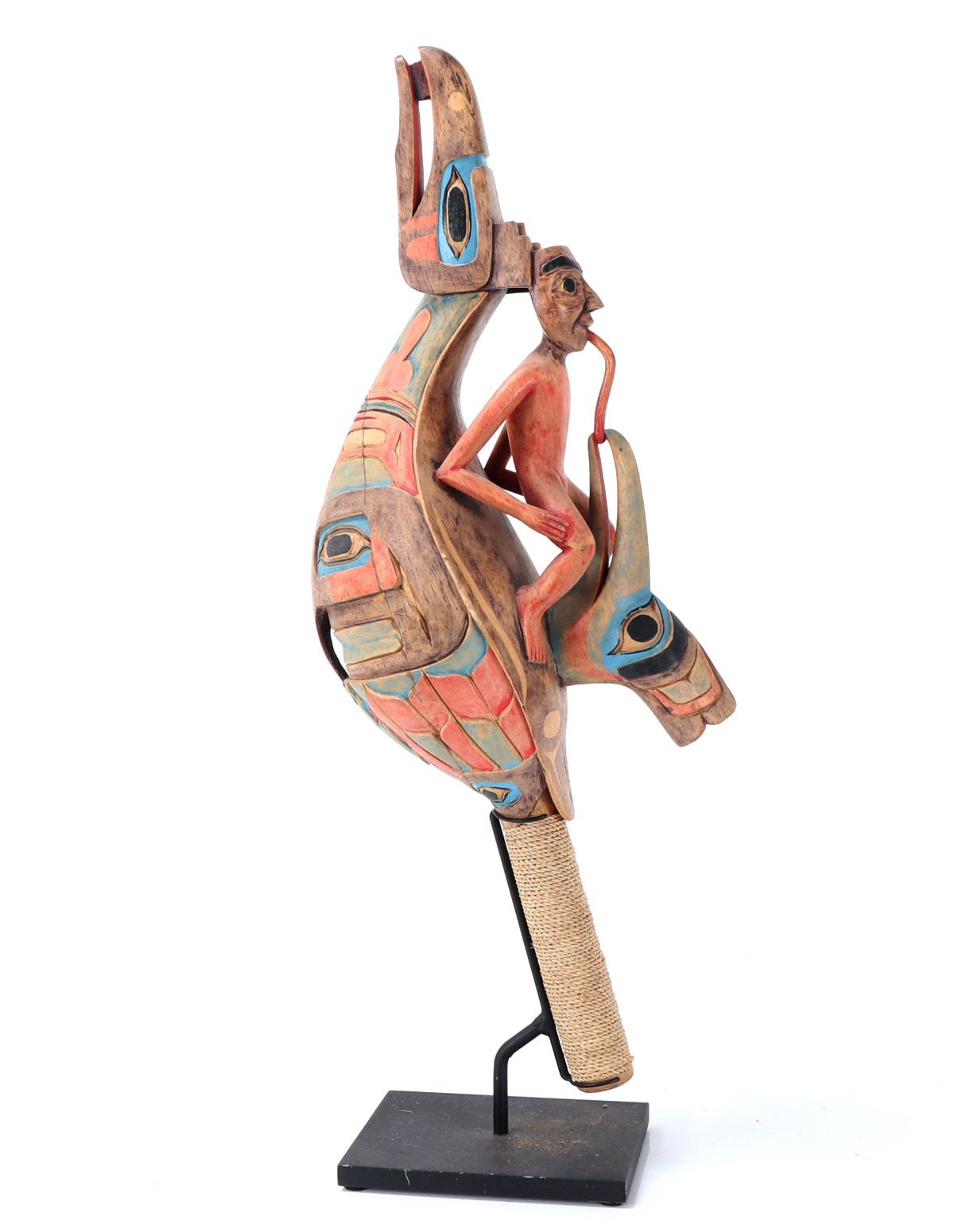 Handsome wood carved ceremonial rattle from Pacific Northwest, Haida. Relaxed man on a bird with an oystercatcher seemingly being fed by the oystercatcher. Well wrapped handle in a tight twisted fiber, a birds mouth eats at the handle. Painted all over in orange, red, blue, green and yellow pigment throughout. Size 16" L x 4" W x 4" H, weight 280g, custom stand included.. Condition: Overall good condition with minor pigment losses.