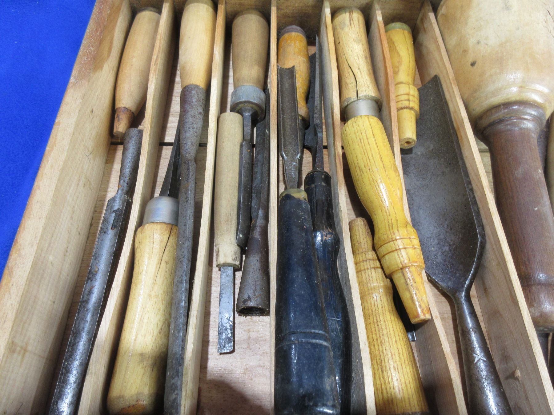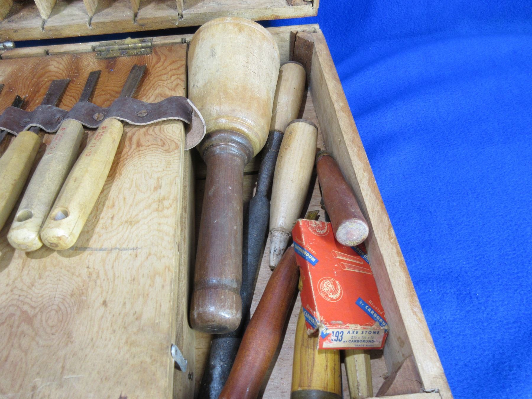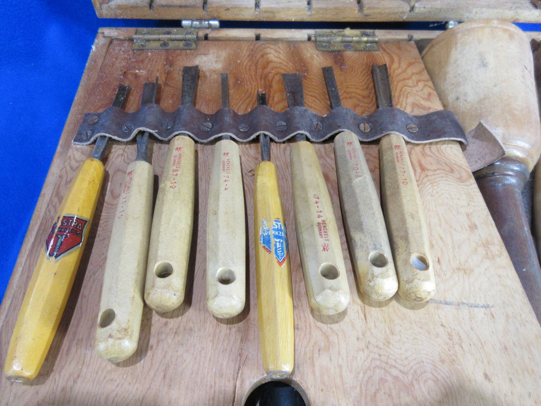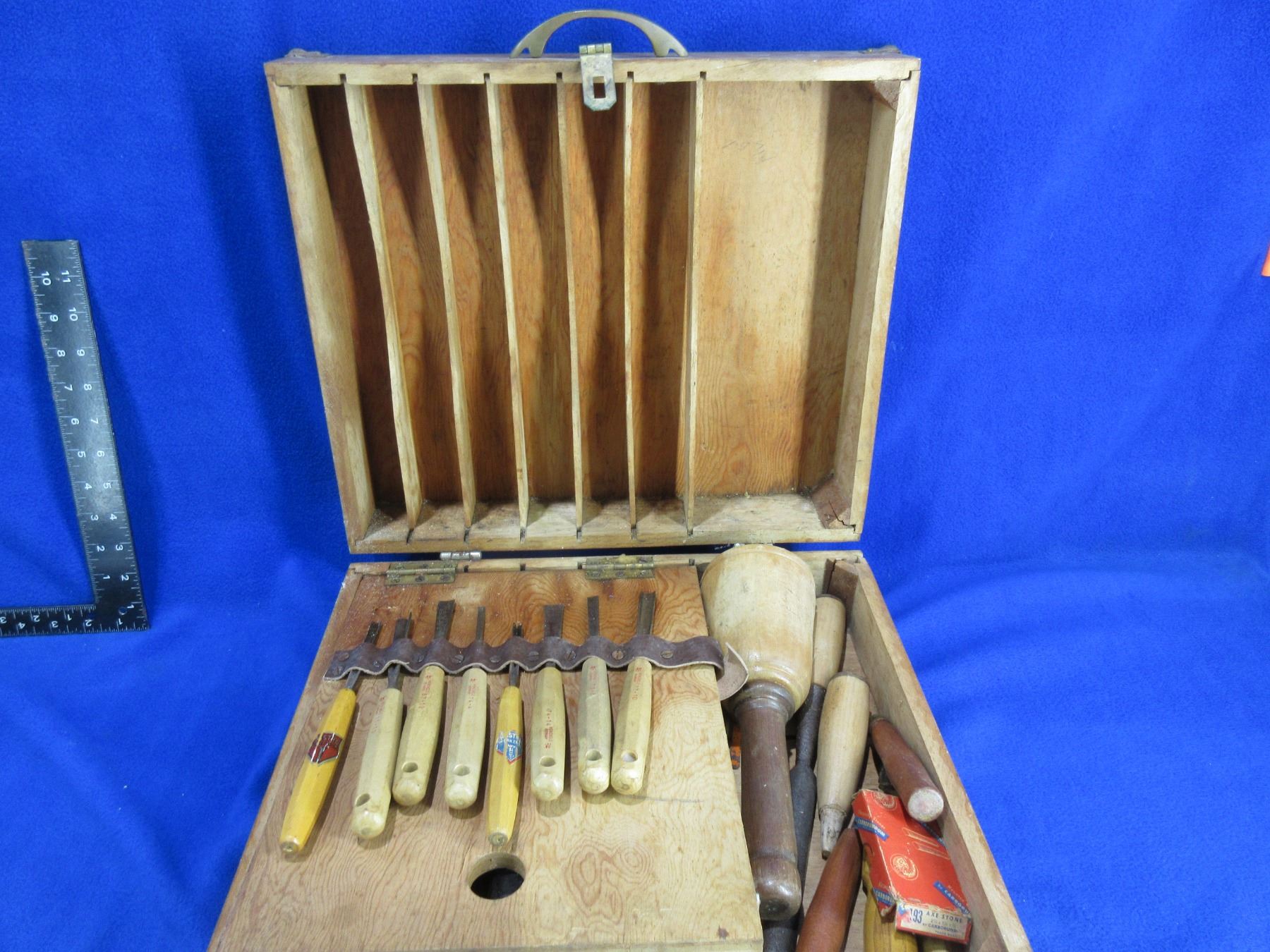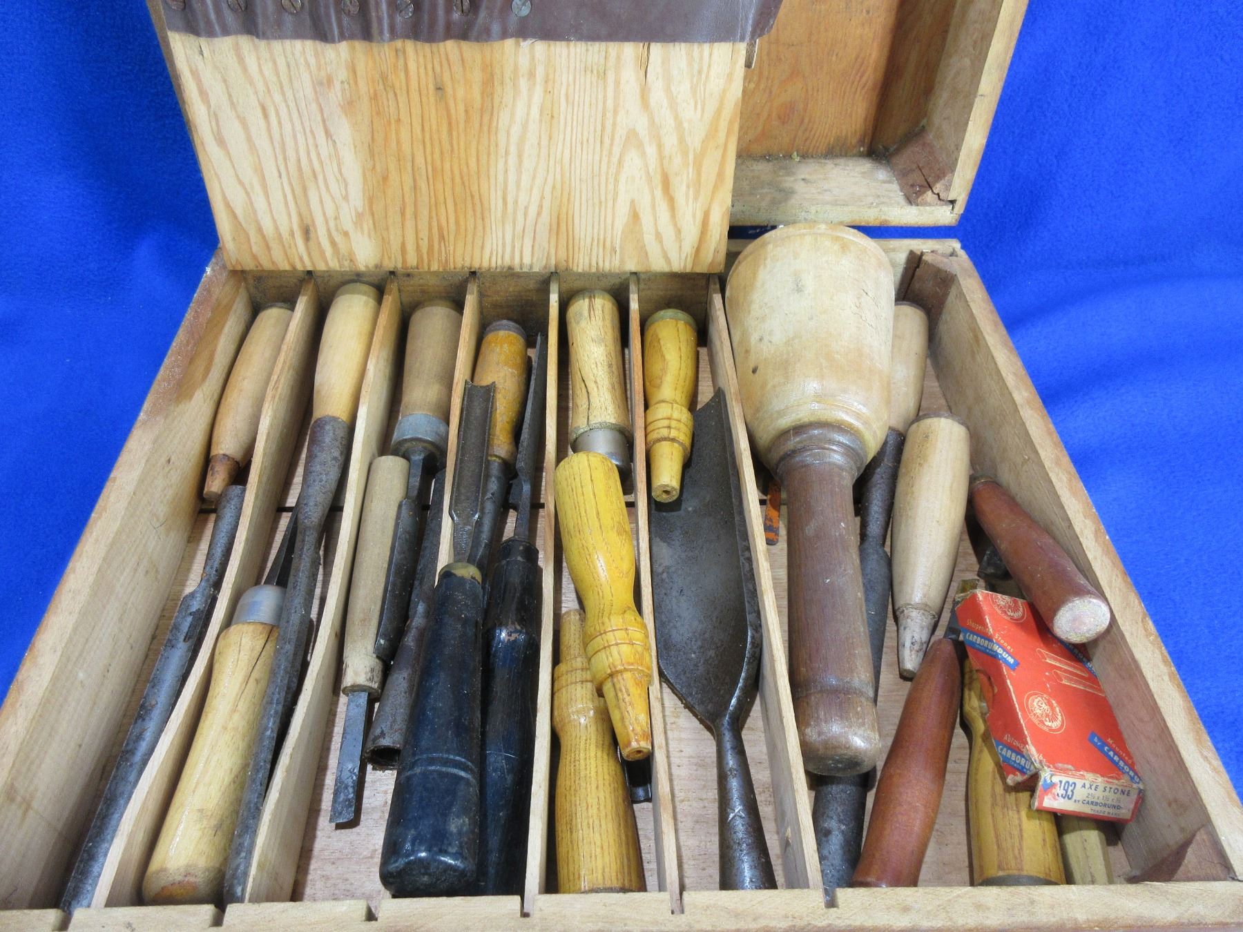 Wood Carving Kit in Wood Box - Henckels and Dastra Tools - Box has a broken hinge