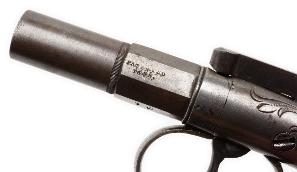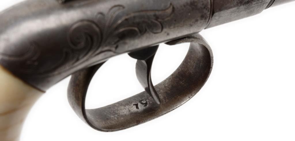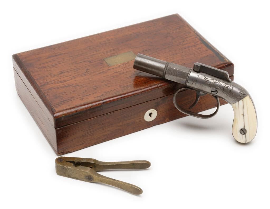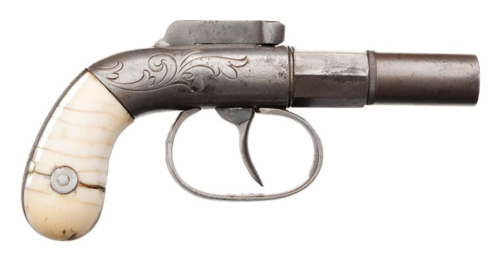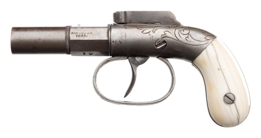 Wood cased engraved Allen & Thurber DA bar hammer pistol, .31 caliber, 2” barrel, S/N 19, ivory grips. This single shot pistol is in overall very good condition displaying a rey patina to metal surfaces, good action, sharp engraving with “PATENTED 1845” stamped on left side flat of barrel; classic old ivory grips showing age cracklature. Case is hardwood with blank brass plaque in center of lid; interior appears to be an older re-lining in the French style, nicely accomplished and set up for the fitted pistol and a brass bullet mold that is included. Est.: $600-$1,200.