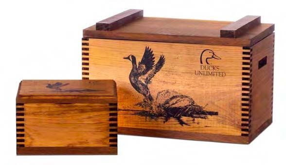 Crafted with timeless detail, the Wooden Storage Set includes a two-piece collection featuring a desktop accessory box and a larger storage case. Both pieces are built with dovetail joints and hinged lids for durability and easy access, while showcasing the Ducks Unlimited logo alongside the 2026 Artist of the Year print “Lift” by Stephany Chavez-Kuchera. The storage case measures 17.75” x 10.75” x 11”, and the desktop accessory box measures 9.75” x 7.37” x 5.75”, making the set both functional and visually striking. Proudly made in the USA, this storage set is a perfect blend of craftsmanship, artistry, and Ducks Unlimited tradition.
