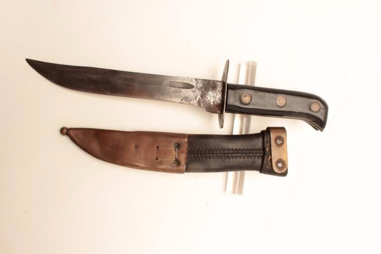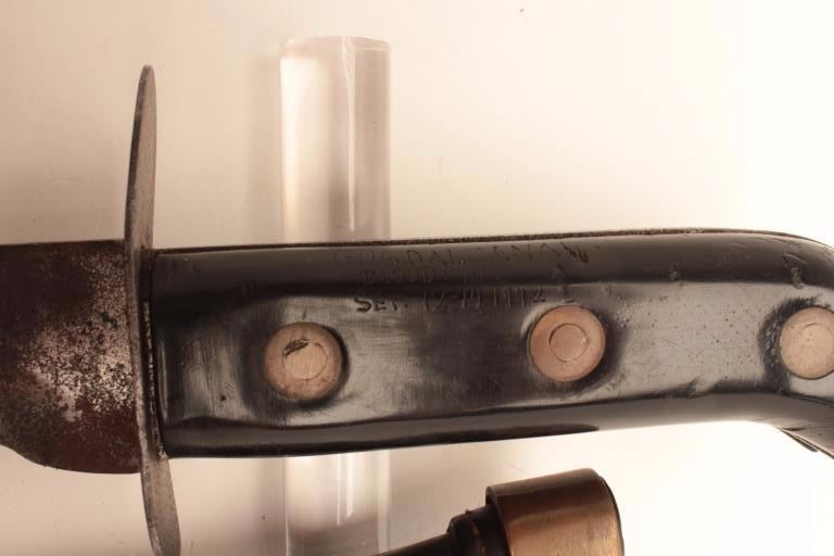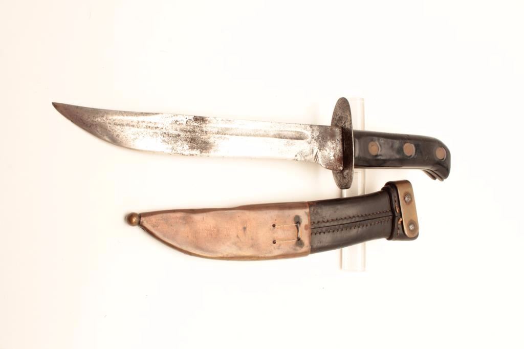 World War II Japanese soldier’s personal knife. According to the consignor’s notes, the knife was recovered from, “Bloody Hill” during the battle of Guadalcanal, September 12-14, 1942. The knife is in good overallcondition with an 8 ½” blade and overall length of 12 ¾”. The blade shows surface erosion and sharpening and an overall grey patina. The black composite handle has, “GUADALCANAL BLOODY HILL SEP. 12-14 1942”etched into the handle with three brass rivets. The scabbard is fashioned from leather and brass with wire. The scabbard is in good condition with a handmade look. This is a great WWII bring back from one ofthe most famous battles in the Pacific theater, from the Gil Newton Collection. Est.: $150-$300.
