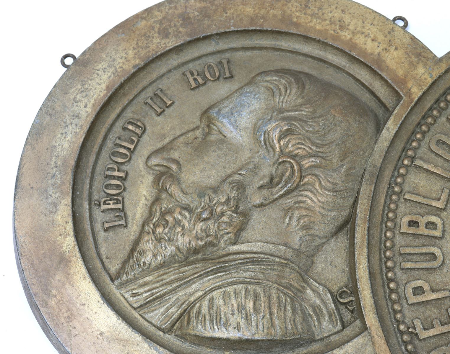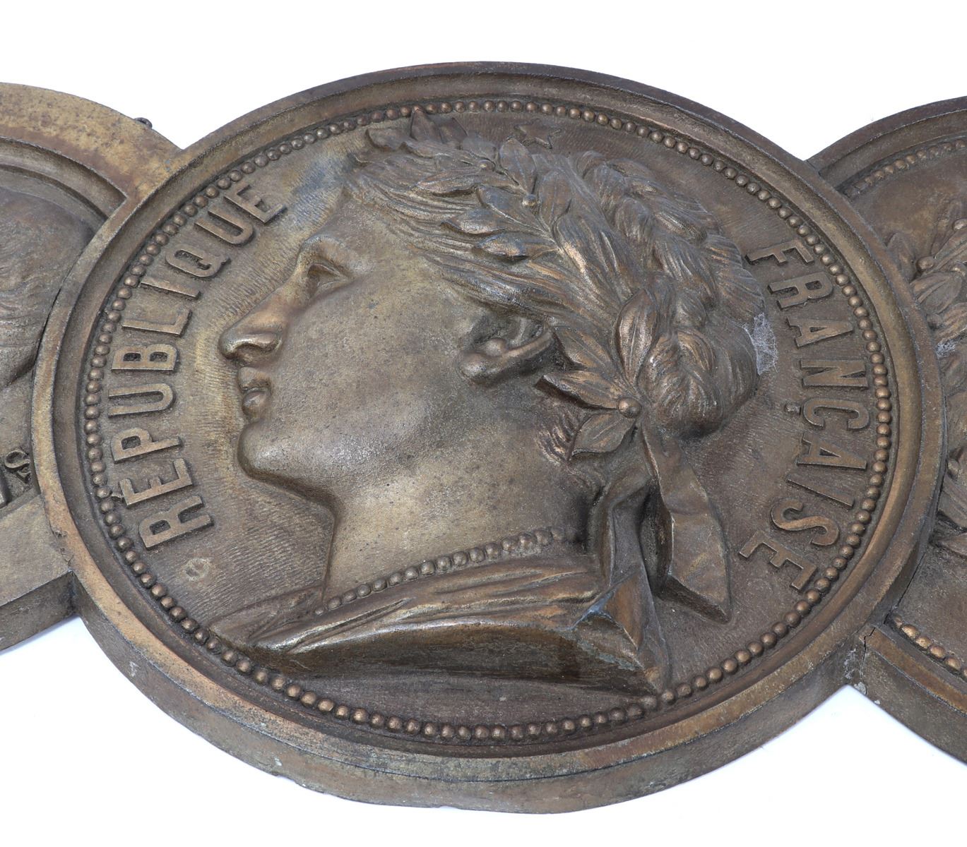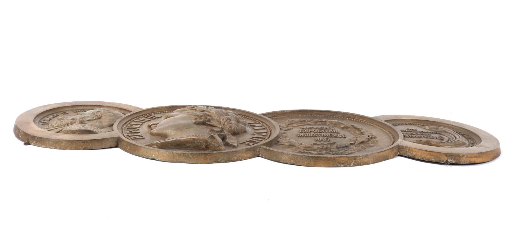 Wonderful Collection of Worlds Fair Exhibition plaques from 1887 and 1888. One with the profile of Leopold II King of Belgium who oversaw the 1897 Brussels International Exposition a world's fair exposition where he showcased his colonial possessions. Another with the profile of an important figure and reading in French Republique Francaise. Right center a matching pattern plaque with wreath reading Nevers Exposition Industrielle 1887. Right most a plaque with long inscription reading Des Sciences & De L'Industrie bruxelles 1888. Size 35" L x 13" W x 2" H. Provenance: Ex-Southern California Collection