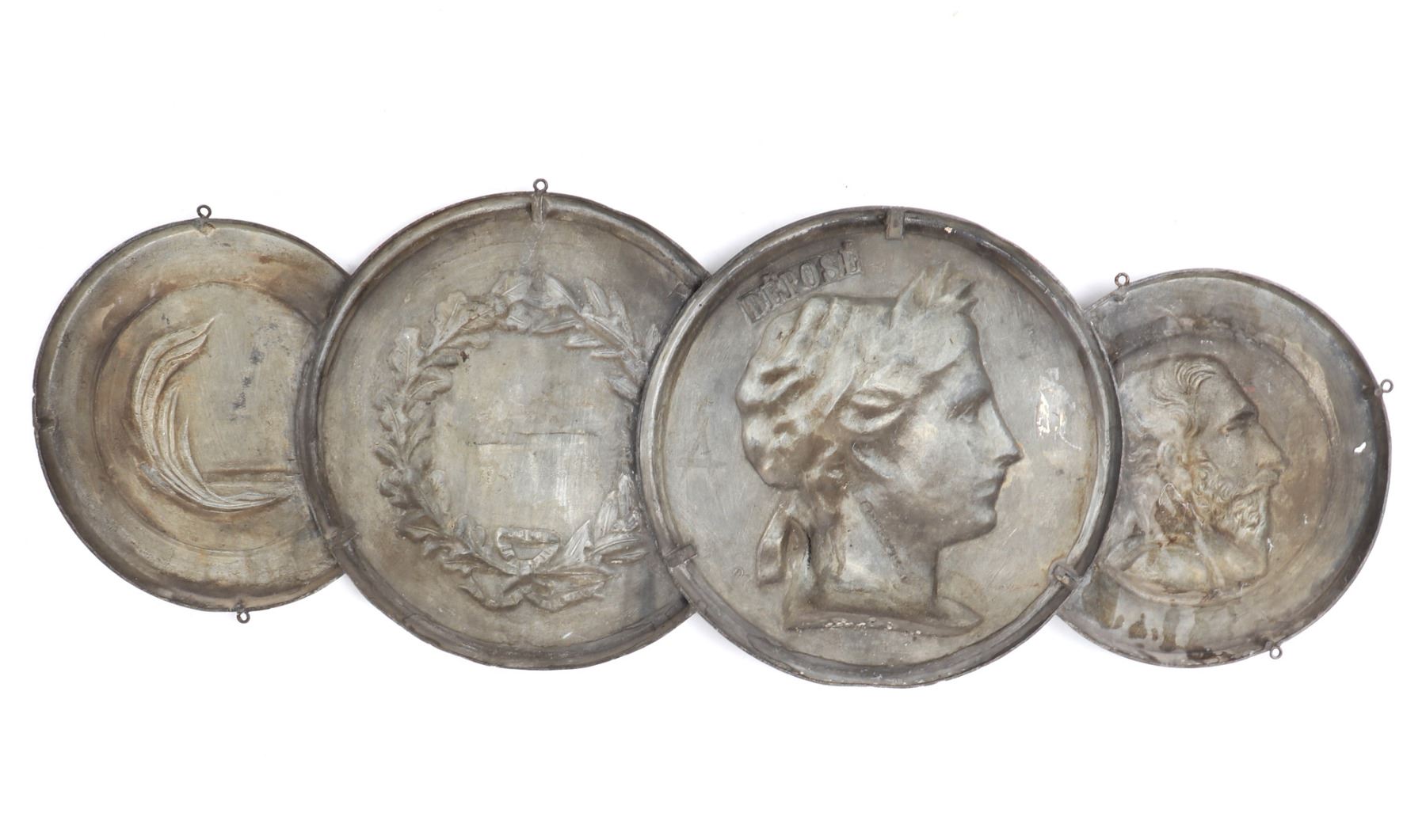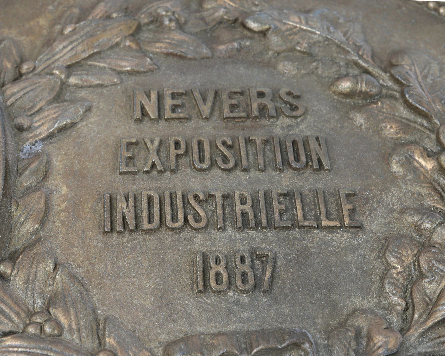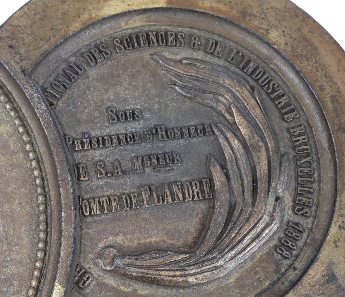 Wonderful Collection of Worlds Fair Exhibition plaques from 1887 and 1888. One with the profile of Leopold II King of Belgium who oversaw the 1897 Brussels International Exposition a world's fair exposition where he showcased his colonial possessions. Another with the profile of an important figure and reading in French Republique Francaise. Right center a matching pattern plaque with wreath reading Nevers Exposition Industrielle 1887. Right most a plaque with long inscription reading Des Sciences & De L'Industrie bruxelles 1888. Size 35" L x 13" W x 2" H. Provenance: Ex-Southern California Collection