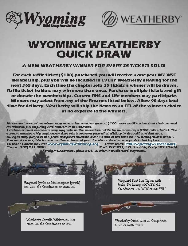 All current annual members may renew for another year at $100 upon notification that their annual membership is expiring and remain in the contest. Existing annual members may upgrade to the incentive raffle by purchasing a $100 raffle ticket. Their current membership expiration date will have one year of eligibility in the raffle added to it. All ages may play but the prize recipient must be over 18 and must pass an FFL background check. You must be eligible to receive these items at your location. Void where prohibited by law. To order tickets on line; www.wyomingwildsheep.org. Email us at: info@wyomingwildsheep.org Phone: (307) 213-0998 Mail: WY-WSF, P.O.Box 666, Cody, WY. 82414 Foreign customers, please call us with a credit card payment.