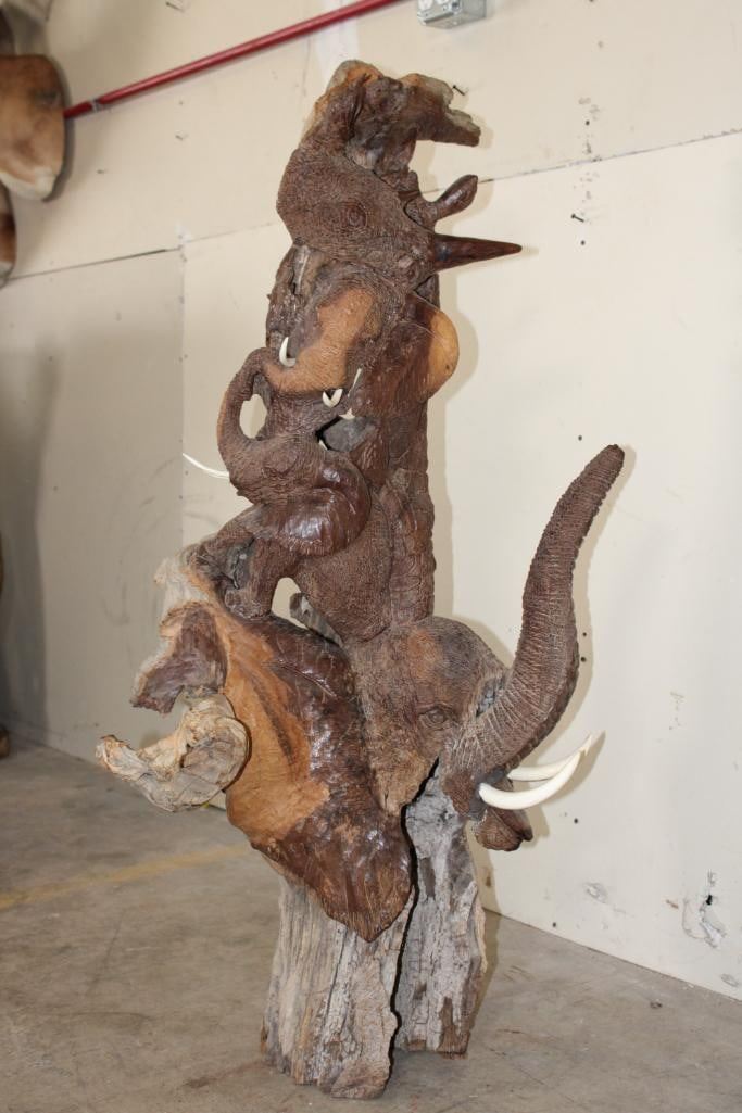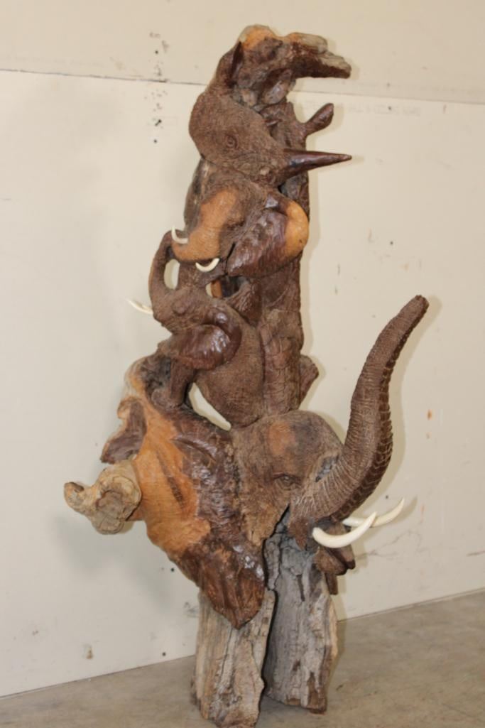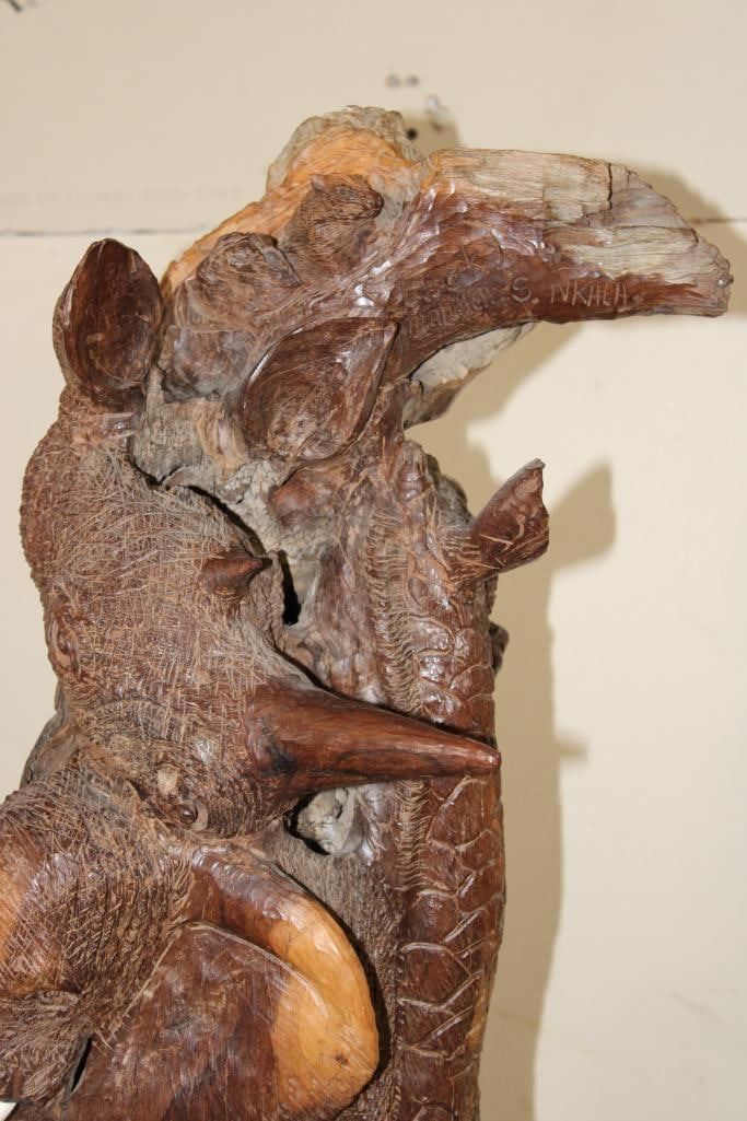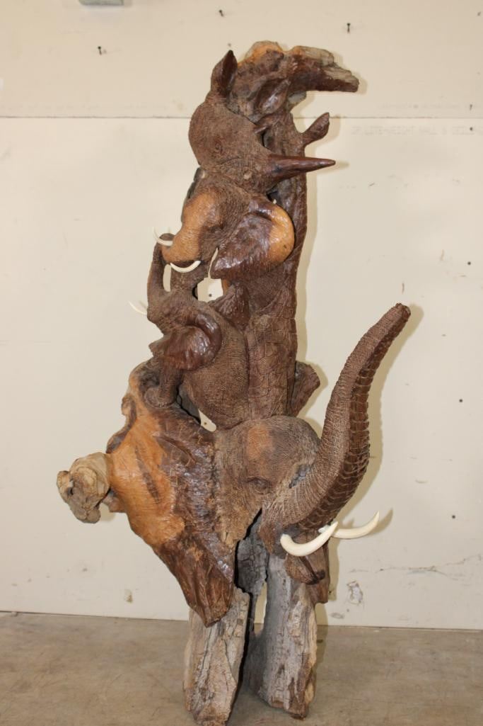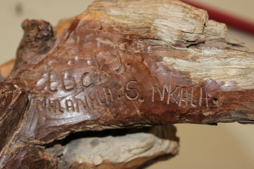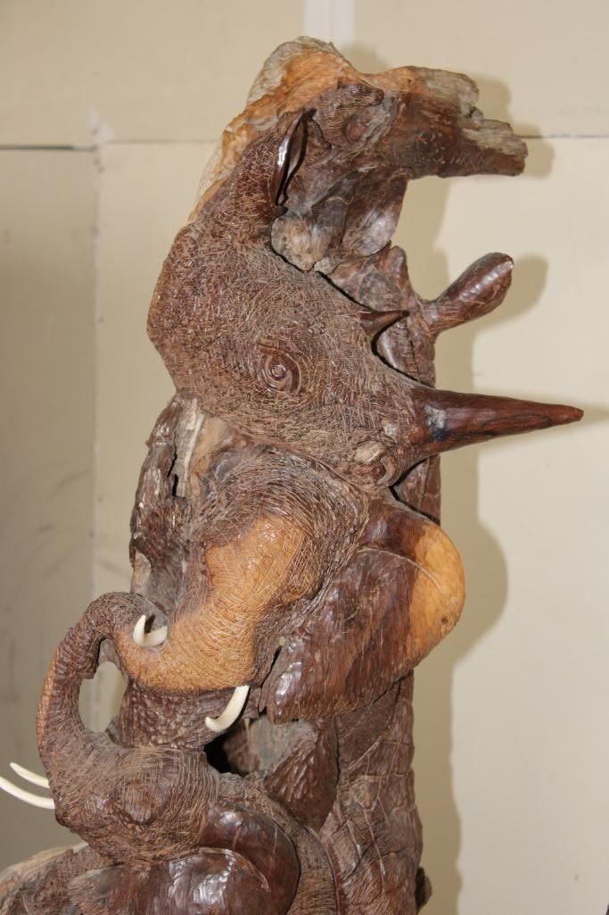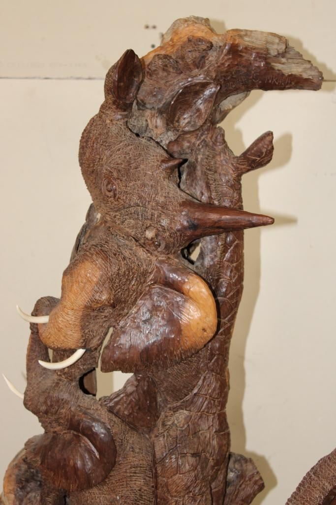 XL 4' Original Leadwood Hand-carved Sculpture "Lucky" by African artist Nhlanhla S. Nkala. This stunning sculpture depicts 3 Elephants, 2 Giraffes, and a Rhinoceros. The Elephants Tusks are believed to be carved from Warthog Tusk. The sculpture measures 51" Tall x 25" Long x 22" Wide and Weighs approximately 100 lbs. The artist has carved "Lucky. Nhlanhla. S. Nkala" into the piece. COLLECTIBLE AFRICAN ART SCULPTURES AND CARVINGS
