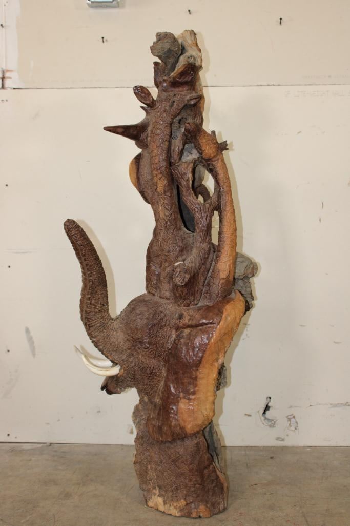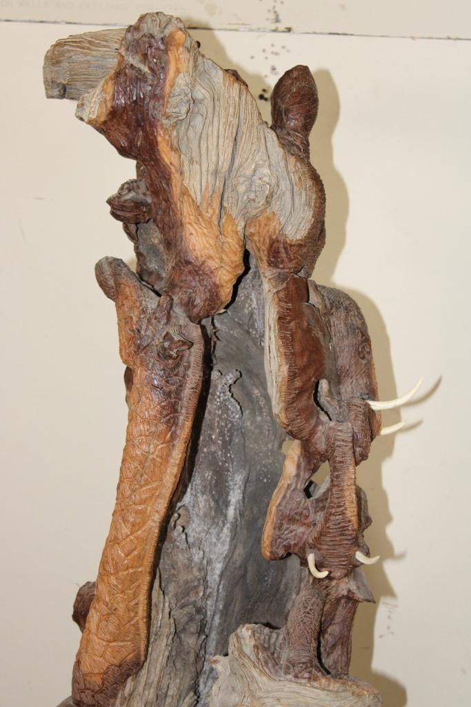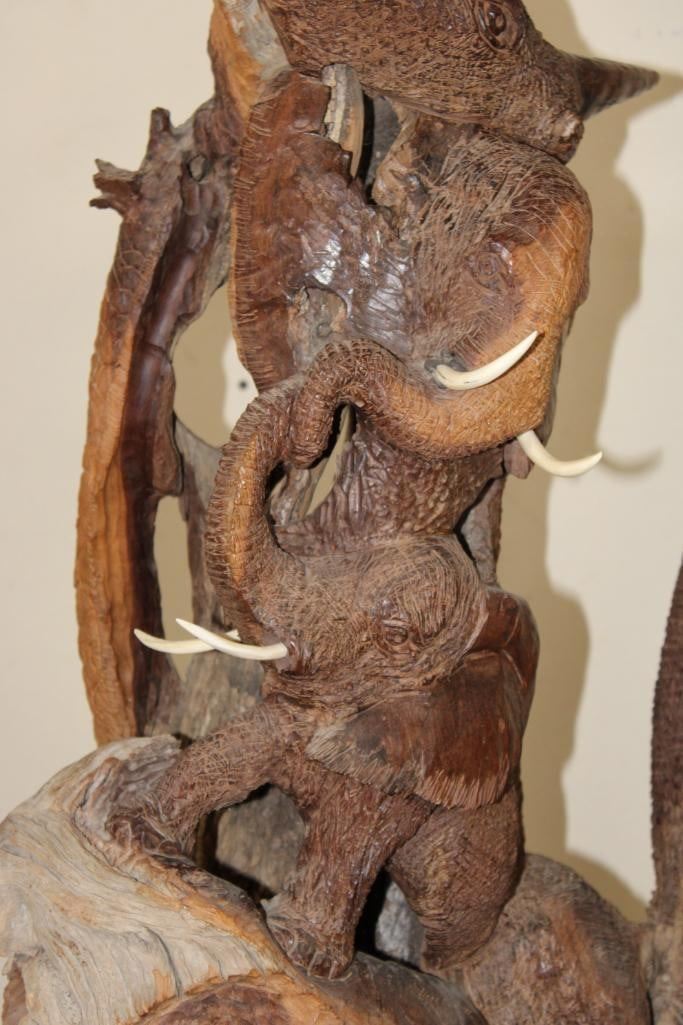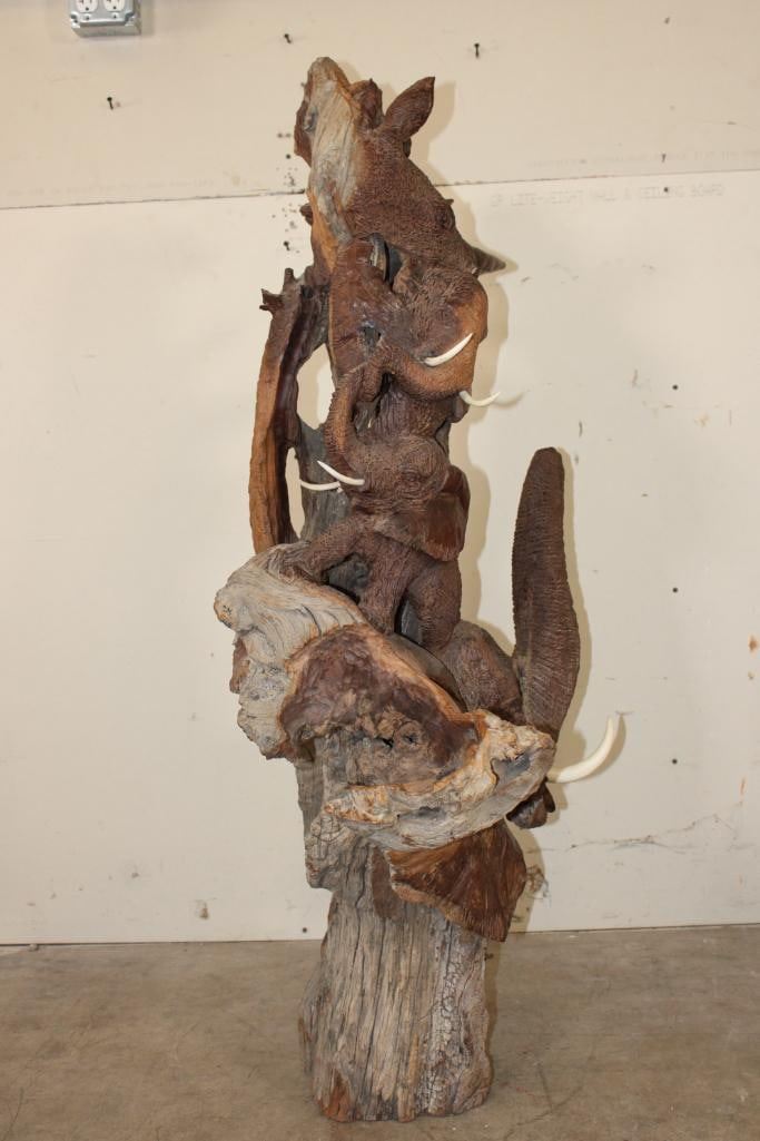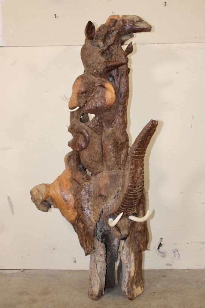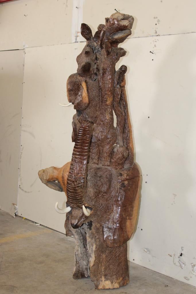 XL 4' Original Leadwood Hand-carved Sculpture "Lucky" by African artist Nhlanhla S. Nkala. This stunning sculpture depicts 3 Elephants, 2 Giraffes, and a Rhinoceros. The Elephants Tusks are believed to be carved from Warthog Tusk. The sculpture measures 51" Tall x 25" Long x 22" Wide and Weighs approximately 100 lbs. The artist has carved "Lucky. Nhlanhla. S. Nkala" into the piece. COLLECTIBLE AFRICAN ART SCULPTURES AND CARVINGS
